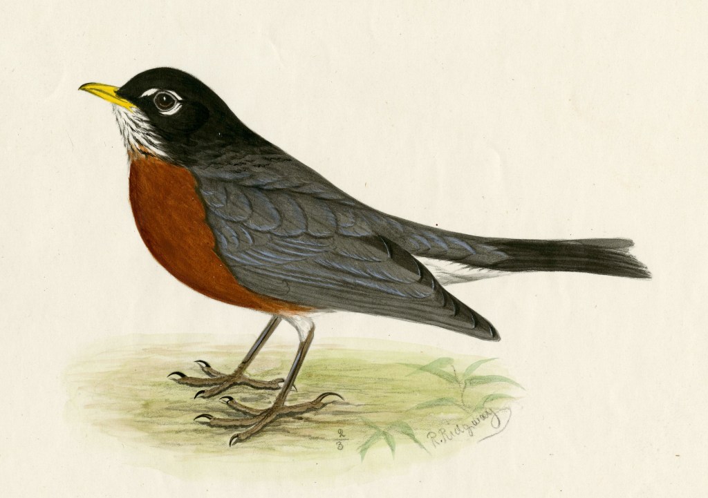 Growing up in Illinois, Ridgway was fascinated by the natural world. He also liked sketching, and combined the two interests in detailed drawings of birds. In 1864, when he was fourteen years old, he was having trouble indentifying one of the birds he’d drawn. A friend’s mother suggested he send the picture to the Commissioner of Patents in Washington, an acquaintance of hers. He did, and in a few weeks, received a letter back from Spencer Fullerton Baird, the Assistant Secretary of the Smithsonian Institution. It was the start of a lifelong relationship. Baird, impressed with the young Ridgway’s skill and enthusiasm, encouraged him, and when Ridgway was only seventeen Baird arranged for him to join the prestigious United States Geological Exploration of the Fortieth Parallel from California to Wyoming. By 1874, Ridgway was appointed to the Smithsonian as an ornithologist, where he soon became the Smithsonian’s Curator of Birds, a position he held for the rest of his life.