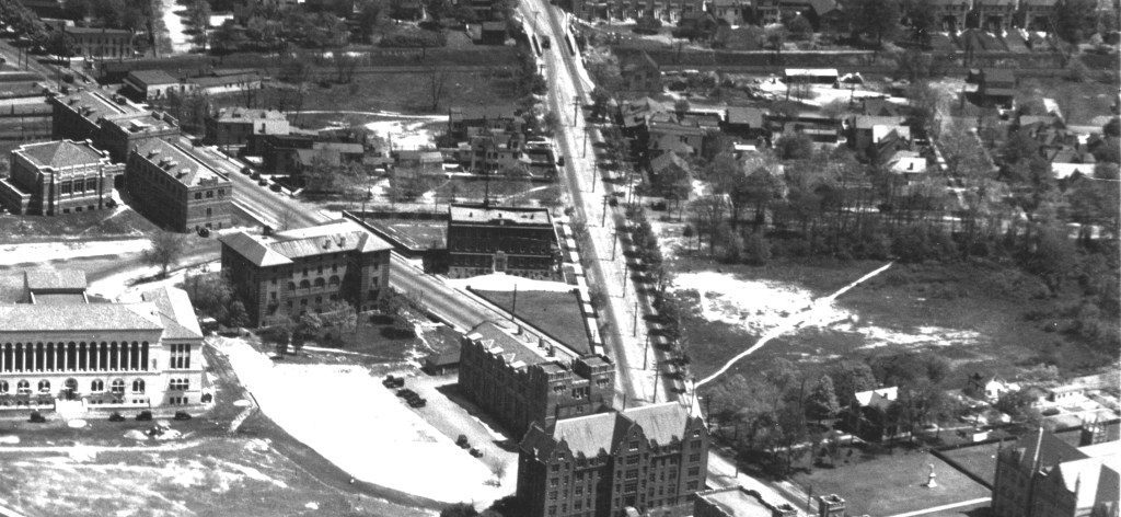 Moving counter-clockwise, the triangle of land where the Portland Flats building now stands wasn’t built on until 1923, when the Franciscan order of Minor Conventuals erected a House of Studies there. Catholic University eventually bought the building and renamed it St. Bonaventure Hall. It was primarily used for such administrative offices as Student Housing and Career Services. It was torn down in 2007.
