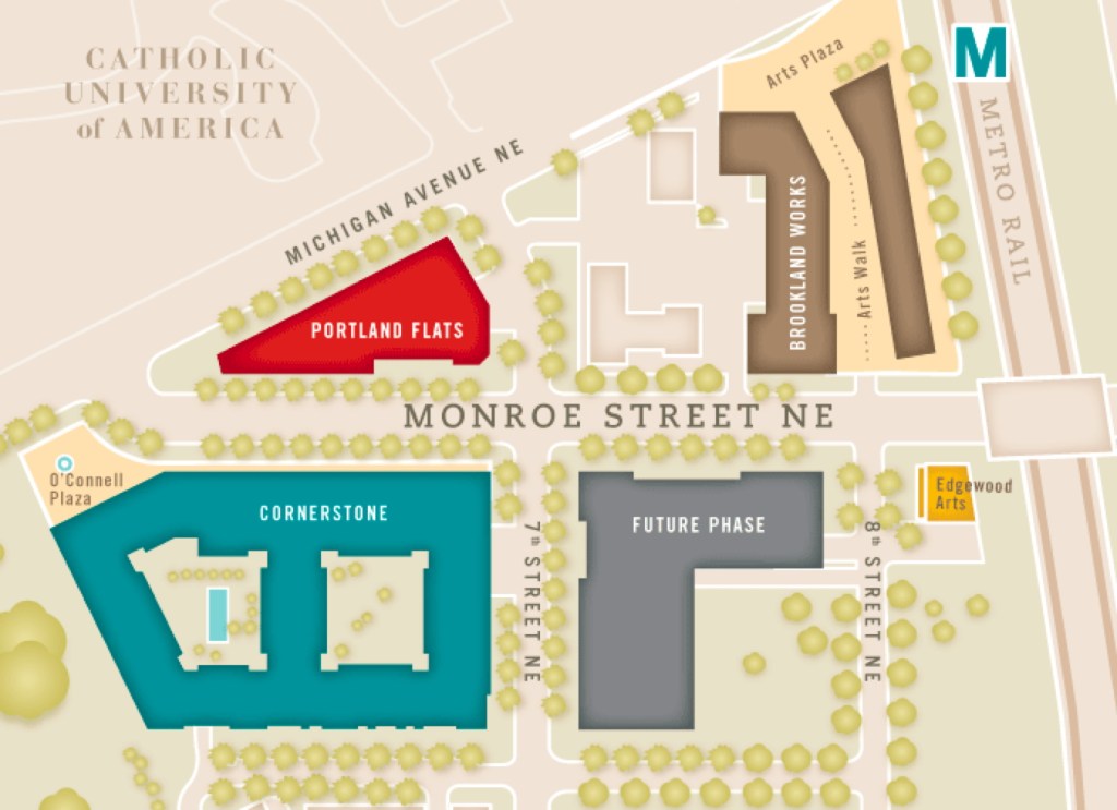 The area on the south side of Monroe Street, where the Cornerstone building now stands, remained unused until World War II, when temporary government housing was erected there. In the 1960s, Catholic University built three architecturally uninspired dormitories on the plot. I lived in two of them as a student, and wasn’t sorry to see them go.