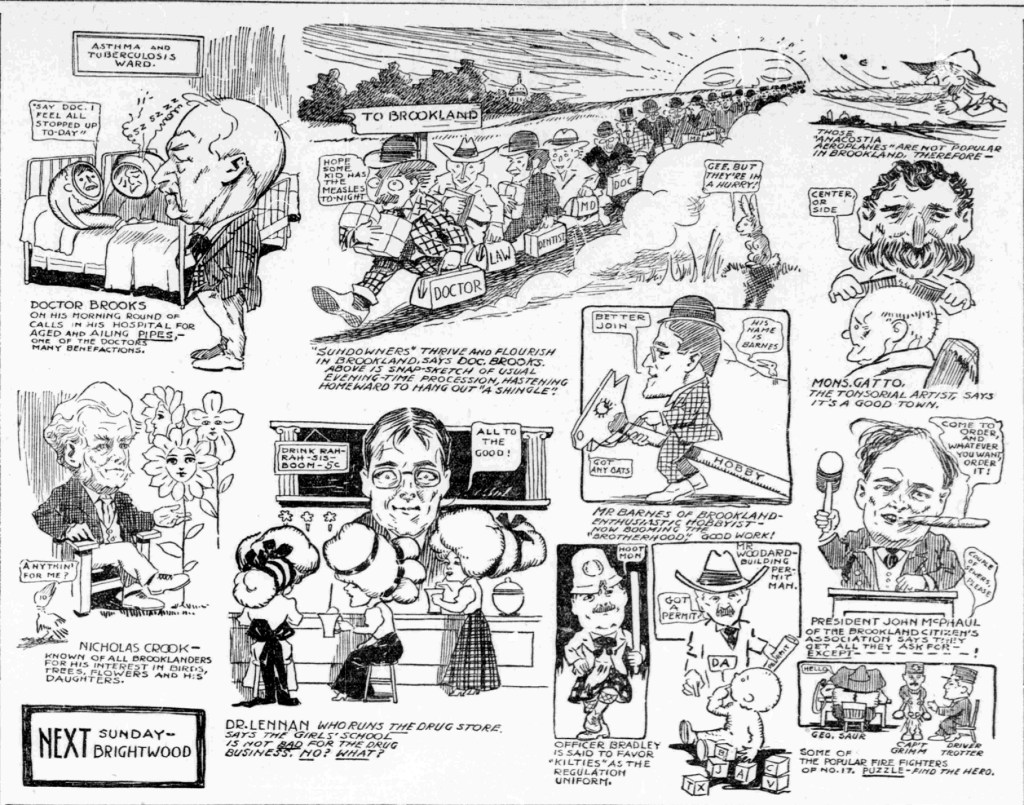 The article that accompanied the cartoon is too long to reprint here, but it does explain what they mean by “sundowners,” quoting Dr. J.H. Brooks: “We are all sundowners out here. Wait around until nightfall and the folks will come in from the Government departments. Our doctors, lawyers, merchants and other leading lights never hang out their shingles until after sundown. Yes, indeed, business picks up a bit out this way at night.” Dr. Brooks was the son of Jehiel Brooks, for whom the neighborhood is named.