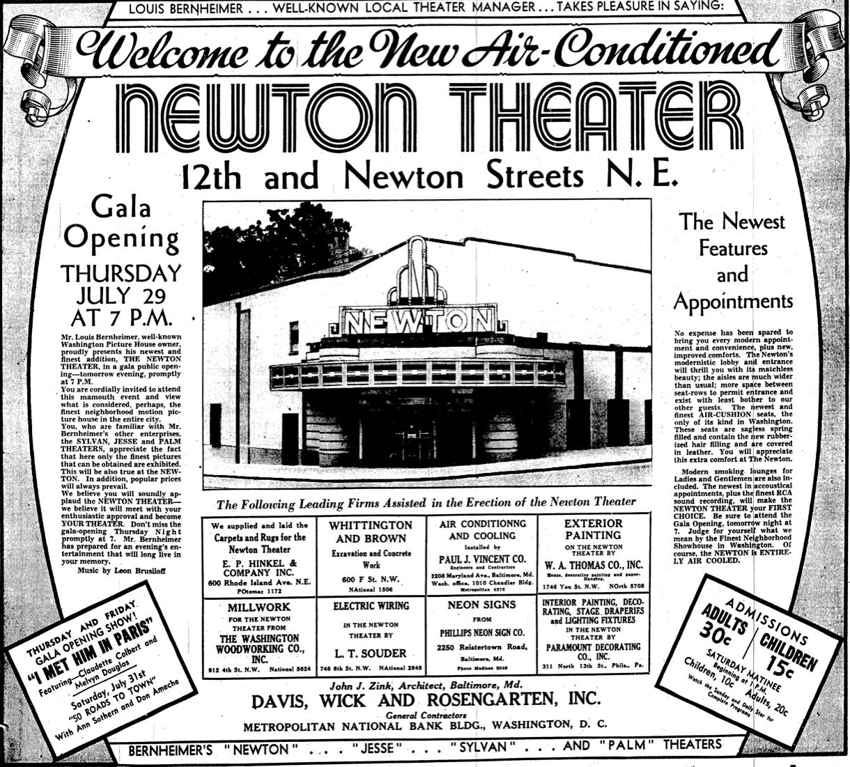 In 1937, Jesse Sherwood Jr. built and opened what was billed as “the finest neighborhood showhouse in Washington” – the Newton Theater, designed by John Zink and operated by Louis Bernheimer. Located at 12th and Newton Streets on the site of the old Brookland Baptist Church, which had burned in 1926, the art-deco theater opened to great fanfare.