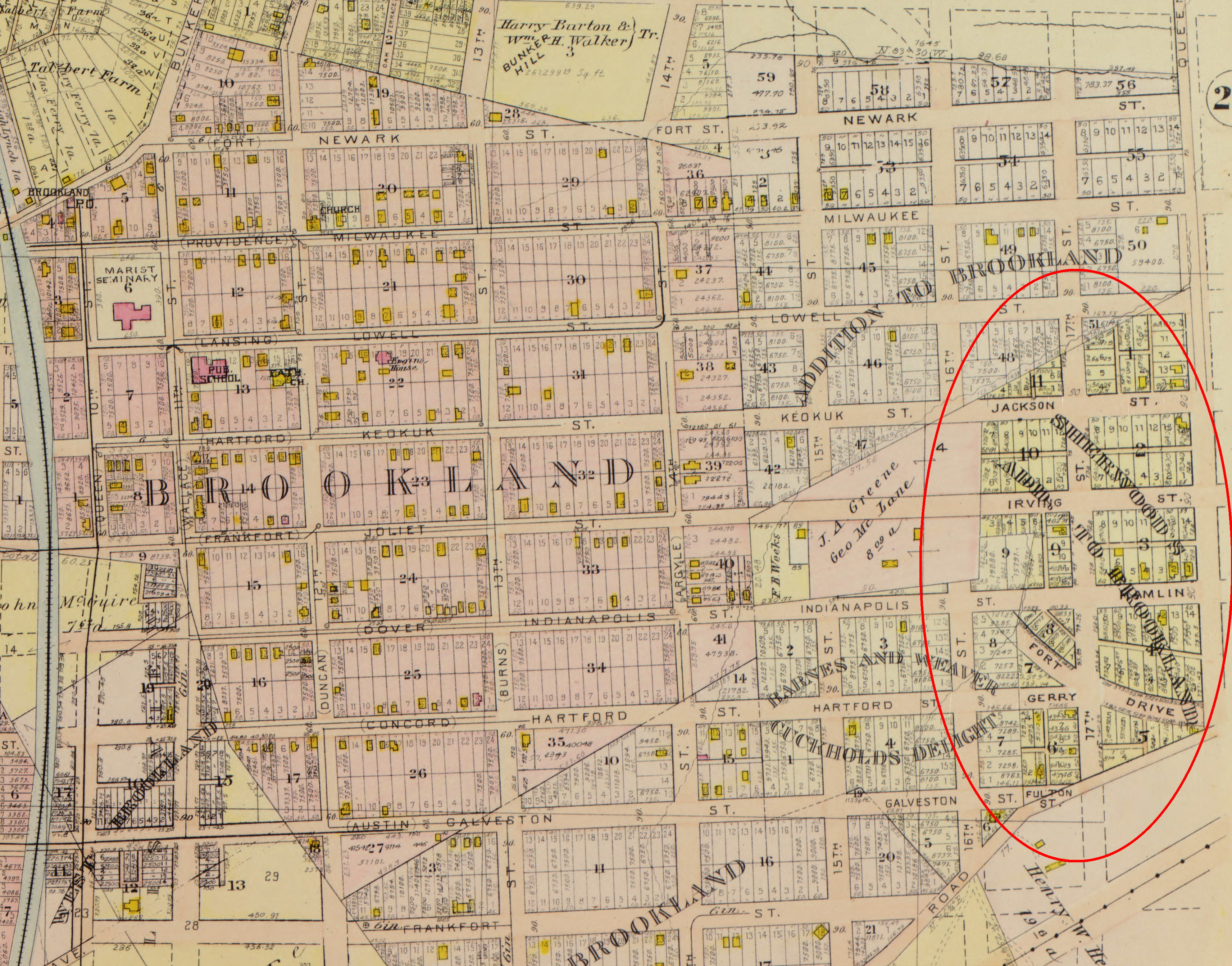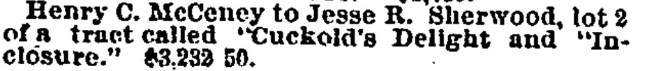Sherwood’s tract is clearly marked on the 1887 Hopkins map, which shows the area just before Brookland began to be subdivided. (By the way, the origin of the name “Cuckold’s Delight” is lost to time; it dates from the land patents of the colonial era.)
