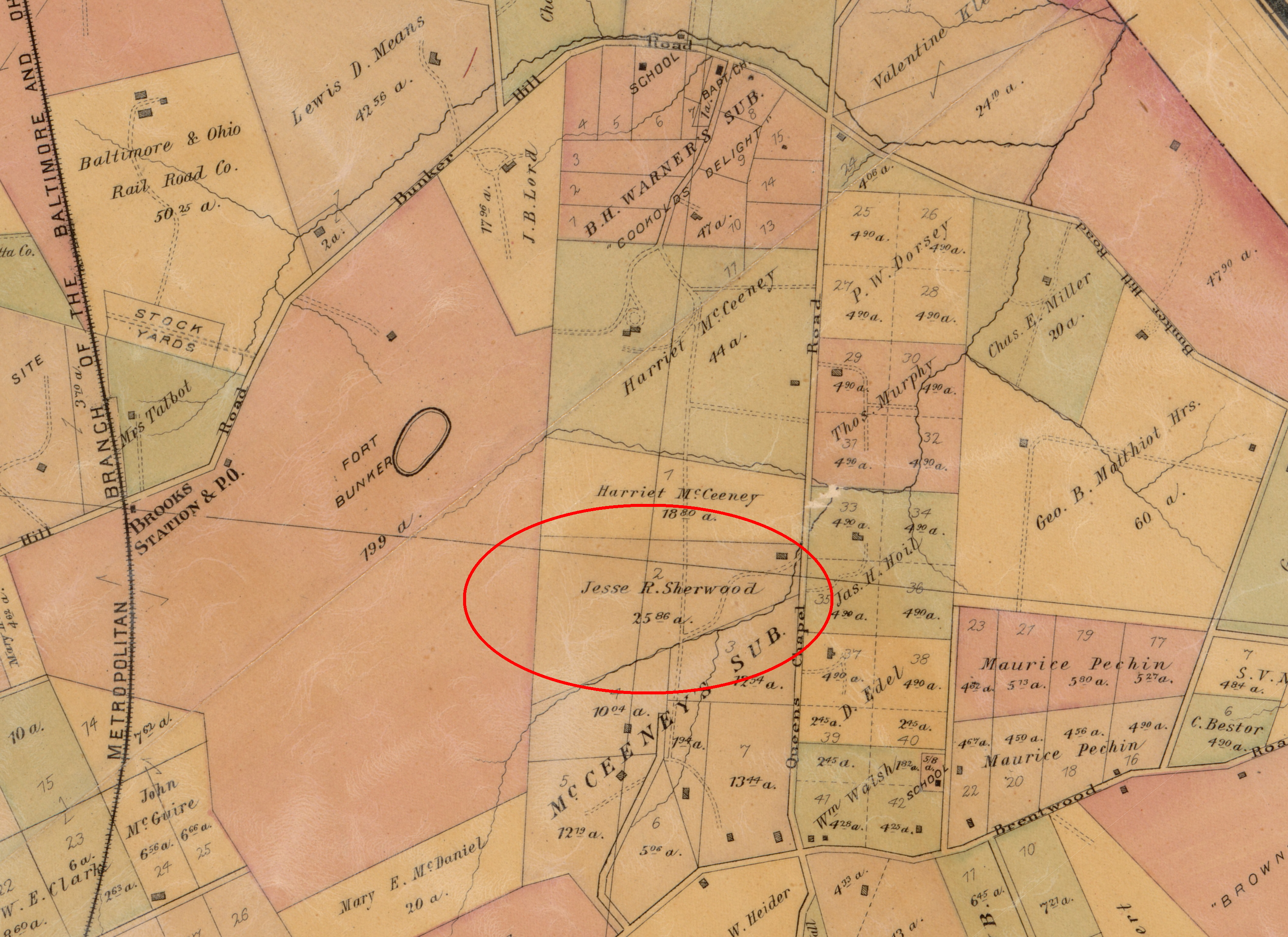 Jesse Sherwood had purchased those 25 acres from the McCeney family, who owned a good bit of land in the area. The main McCeney farm, just north of the Sherwood tract, would later be sold to the Franciscans, who built their monastery there.
