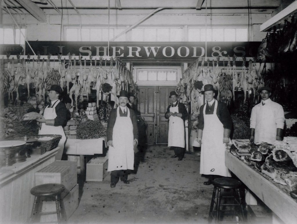 James grew vegetables on his new farm to sell at their markets. Jesse Sr. continued farming his own land, but decided it was time to turn over the management of the market stalls to his sons. Over time, James and Jesse Jr. expanded, adding their own stalls. Here is a photo of James Sherwood (with mustache), his son James Lewis Sherwood, Jr. (second from right) and staff at his place in the early years of the century.