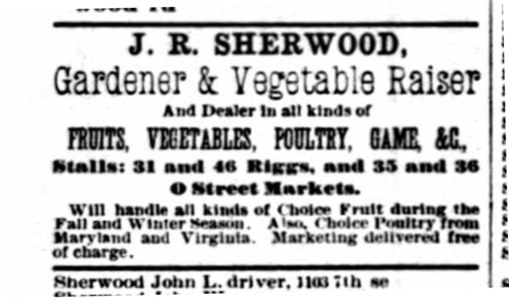 Over the years Sherwood and his two oldest sons, James and Jesse Jr., sold their produce at a number of city markets, but their main stalls were at the Riggs Market on P St. between 14th and 15th Streets NW. (right, advertisement from 1892 DC city directory.)
