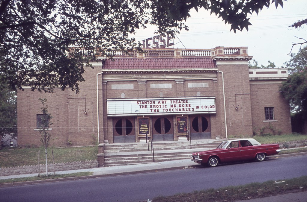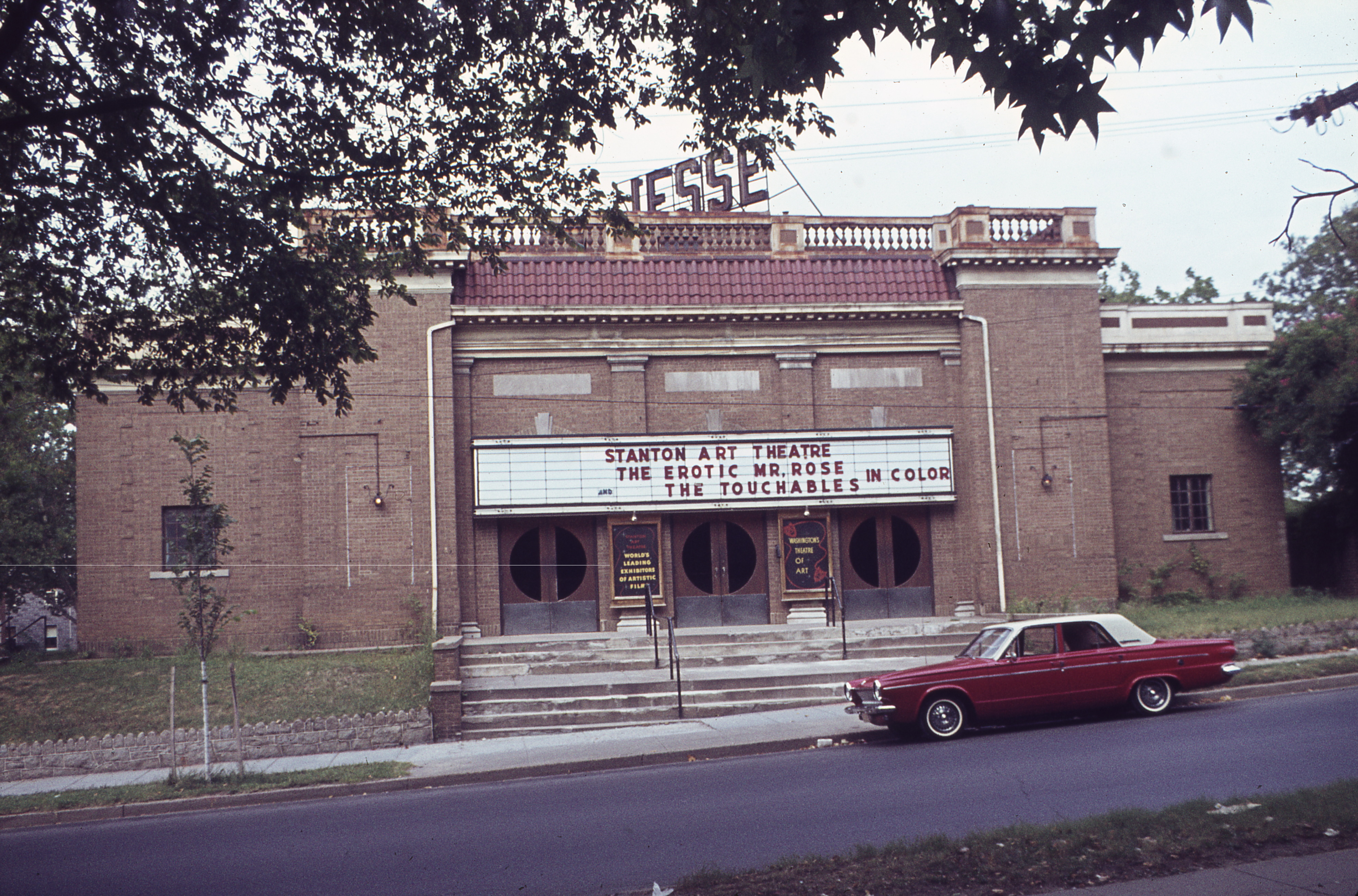 That same year, Jesse Sherwood Jr. opened his second theater, which he named for himself. The Jesse Theater at 18th and Irving Streets NE looked like a medieval fortress and had lights set in the ceiling to resemble stars. The opening film was “Smile, Brother, Smile.” The theater ran successfully for many years until 1953, when Louis Bernheimer, the operator of the theater, began to show art films. Bernheimer changed the name in 1958 to the Stanton Art Theatre, but audiences dwindled, and soon it was showing adult movies. Here is a photo from that period. Notice that the huge “Jesse” sign atop the building remained after the name change.