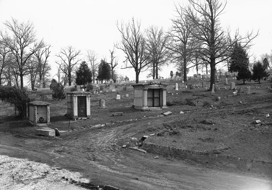 That change coincided with the rise of the Rural Cemetery Movement, which promoted cemeteries as places of well-landscaped beauty and tranquility, with appealing views and walking paths for contemplation. The first rural cemetery in Washington was Oak Hill in Georgetown, which opened in 1849. Soon after came Glenwood on Lincoln Avenue (now Lincoln Road) in 1853. Others began to sprout up, Prospect Hill and Mount Olivet in 1858, and St. Mary’s in 1875. As downtown development increased, so did pressure on the old cemeteries to sell their valuable land. To do so, many began to reinter their graves in the new cemeteries in Washington County.