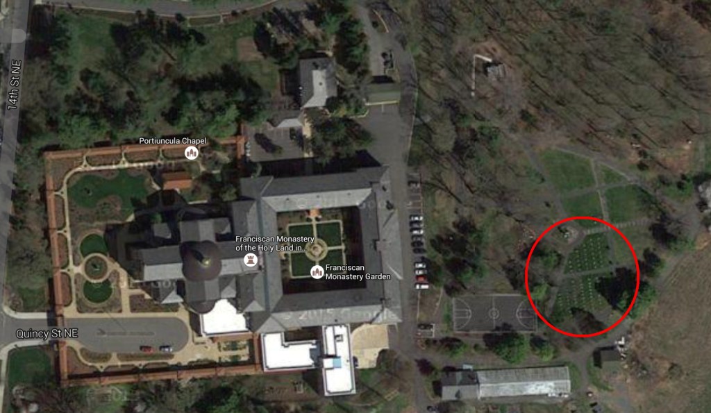 5.) Franciscan Monastery: 1400 Quincy Street NE. The only burial ground within the confines of Brookland proper, the Franciscan Monastery cemetery is for members of the order only. It was proposed in 1900, but a number of the Monastery’s neighbors objected to the cemetery being closer than 200 yards from residential property, which was the legal requirement. After months of negotiations, the Franciscans moved the proposed cemetery to 605 feet away from the nearest dwelling, thus falling within the parameters of the law (barely), and it was built in 1901.