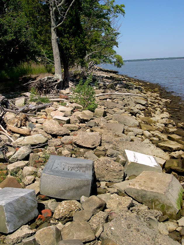 Unfortunately, the deal to move Harmony did not include moving the headstones and memorials, just the graves themselves. For many years, no one knew exactly what happened to the markers. In 2009, some hikers discovered them, lying along the banks of the Potomac River in Virginia. Photographer Edd Fuller visted the site shortly after and took these pictures: