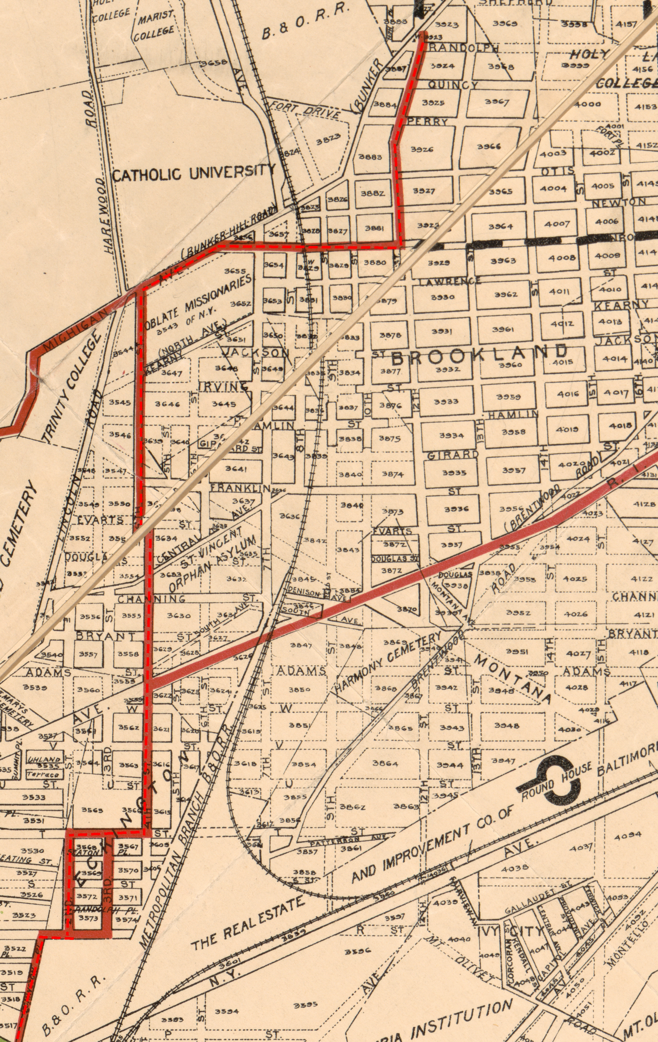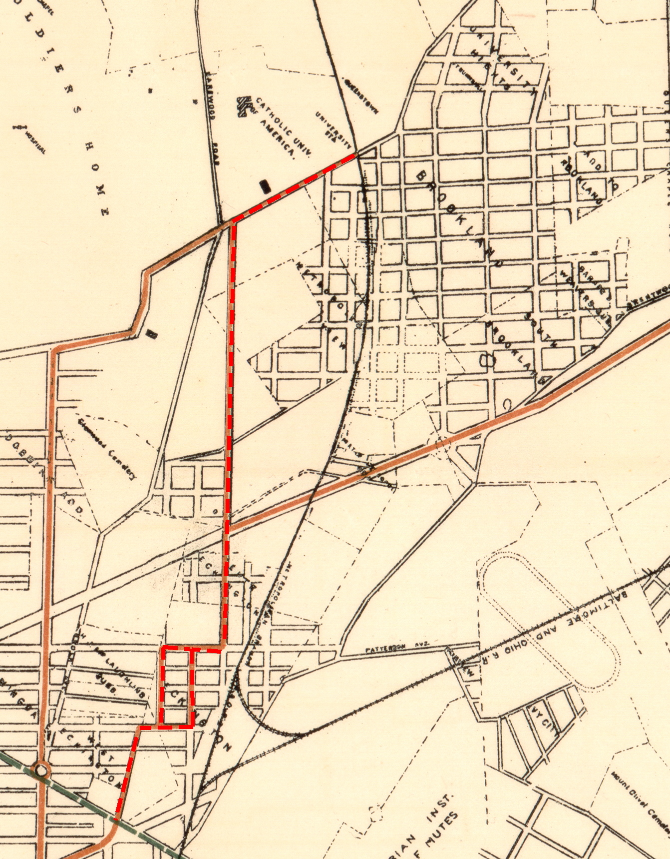 The B&O Railroad connected with the main depot downtown, but that alone was not enough to serve Brookland’s growing commuter needs. Nor were horse-drawn buses from downtown which were painfully slow. But a new electric streetcar had been introduced in 1888, and it could provide the solution. In 1889 a streetcar line was run from downtown along 4th Street to Bunker Hill Road (Michigan Avenue) — great for Catholic University travelers, but a hefty walk for Brooklanders (see map right; click to enlarge). In 1894, the line was extended east along Bunker Hill Road to the railroad tracks and University Station. That was much more convenient, but the streetcars couldn’t cross the railroad tracks, so service still didn’t go into the heart of Brookland (see map below; click to enlarge).