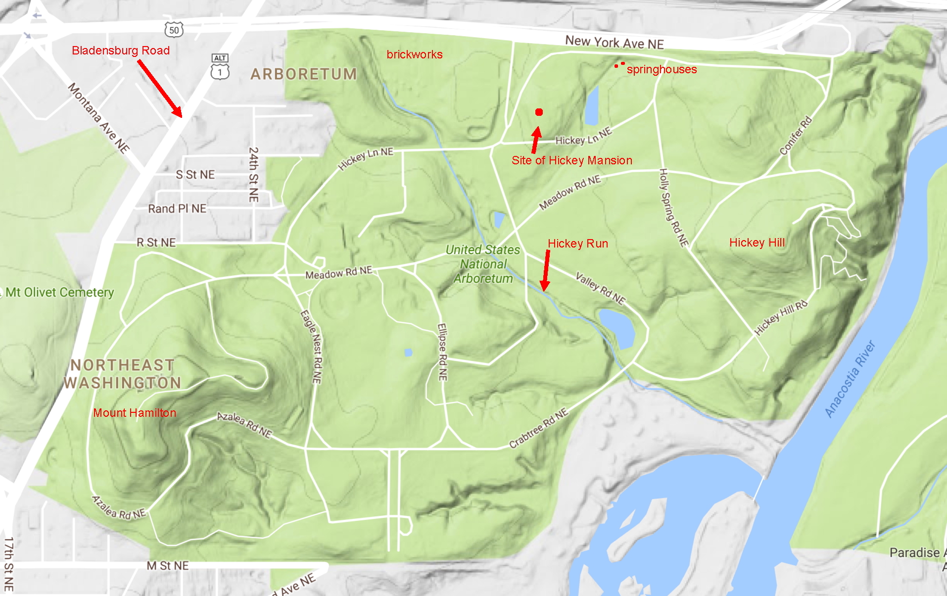 Beneath the science and natural beauty, there are some interesting pieces of Washington history to be found. A stream runs through the grounds named Hickey Run. It emerges from under New York Avenue near Hickey Lane, runs through the valley, skirts Hickey Hill, and empties into the Anacostia River.