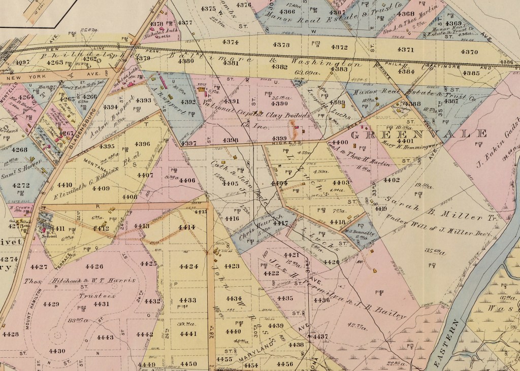 Bottling springwater wasn’t the only business to start on the Greenvale grounds. In 1909, the National Capital Clay Products Company built a factory for firing bricks just a few hundred yards west of the Red Oak springhouse. There were around 100 brickmaking facilities in Washington at that time, most of them small-scale family operations. This new brick company was destined to be one of the largest in the city. It changed title (and name) a few times over the next several years, first to the Hudson Brick and Supply Company, which built a series of square kilns, and then to the United Brick Corporation, which assumed title in 1930. By 1931, the rectangular kilns had been replaced by a dozen round beehive kilns.
