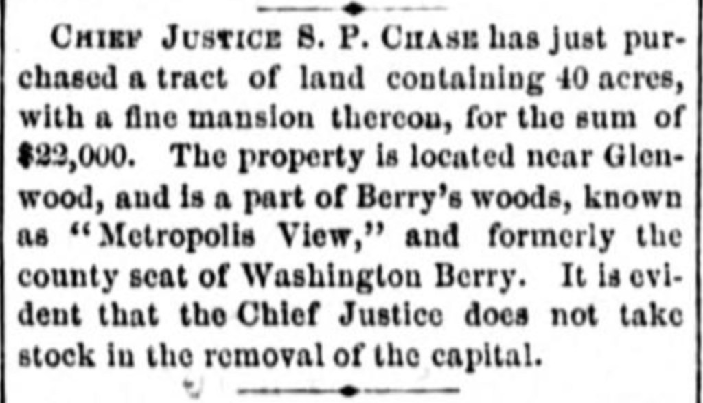 Salmon P. Chase (right) was the Chief Justice of the United States when he bought the Metropolis View property in 1869. Abraham Lincoln had appointed him to the court after Chase resigned as Secretary of the Treasury in Lincoln’s “Team of Rivals” cabinet. And a rival he was. Throughout his career, Chase had one overriding ambition — to become president of the United States. An anti-slavery champion, Chase was Ohio’s governor, then senator, then competed with Lincoln for the 1860 Republican nomination for the presidency, which he lost. He fumbled his chance to run against Lincoln in 1864 with clumsy behind the scenes machinations, and switched to the Democratic Party for the 1868 race, but again was denied the nomination.