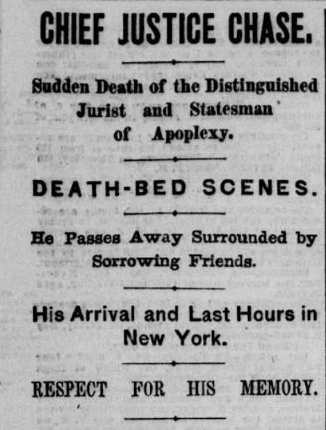 In May, Salmon Chase suffered a massive stroke while in New York visiting his daughter Nettie and her husband William Sprague Hoyt (a second cousin to Kate’s husband). Kate was able to to be at his bedside when he died on May 7th at the age of 65 (left, notice from New York Herald, May 8, 1873). His funeral was attended by President Grant and most everyone of importance in Washington. His body lay in state in the Capitol, on a catafalque that had held the body of Abraham Lincoln eight years previously. Then in September, while Kate was still dealing with her grief, the financial Panic of 1873 hit her husband’s businesses hard. The banks decided they had to place the Sprague companies in a trusteeship. William Sprague was no longer in charge but was given a salary, part of which was to go to Kate as an allowance. Suddenly her beloved father was gone and so was her luxurious lifestyle. It made things even more tense within the marriage.