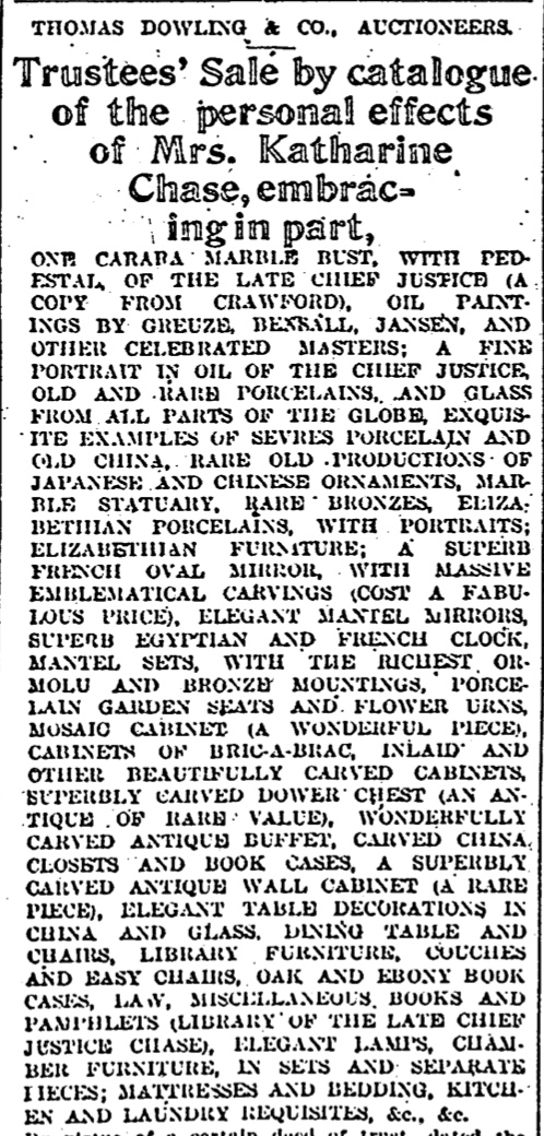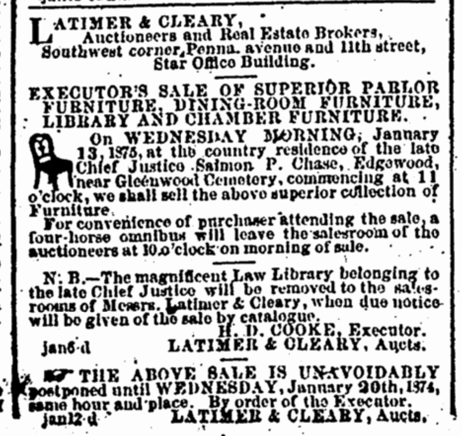 Kate was now living at Edgewood with her daughters, while her son was in school in Germany. But Nettie wanted to sell the estate and divide the profits. The relationship between Kate and Nettie was already frayed due to their husband’s business difficulties, which had the two sides of the Sprague family suing each other. Kate eventually bought out her half-sister’s interest in Edgewood, but Nettie insisted they sell their father’s furniture and other possessions, which pained Kate greatly (right, notice in the Evening Star from January 14, 1875. Click to enlarge). The sisters were now estranged, and would never reconcile.