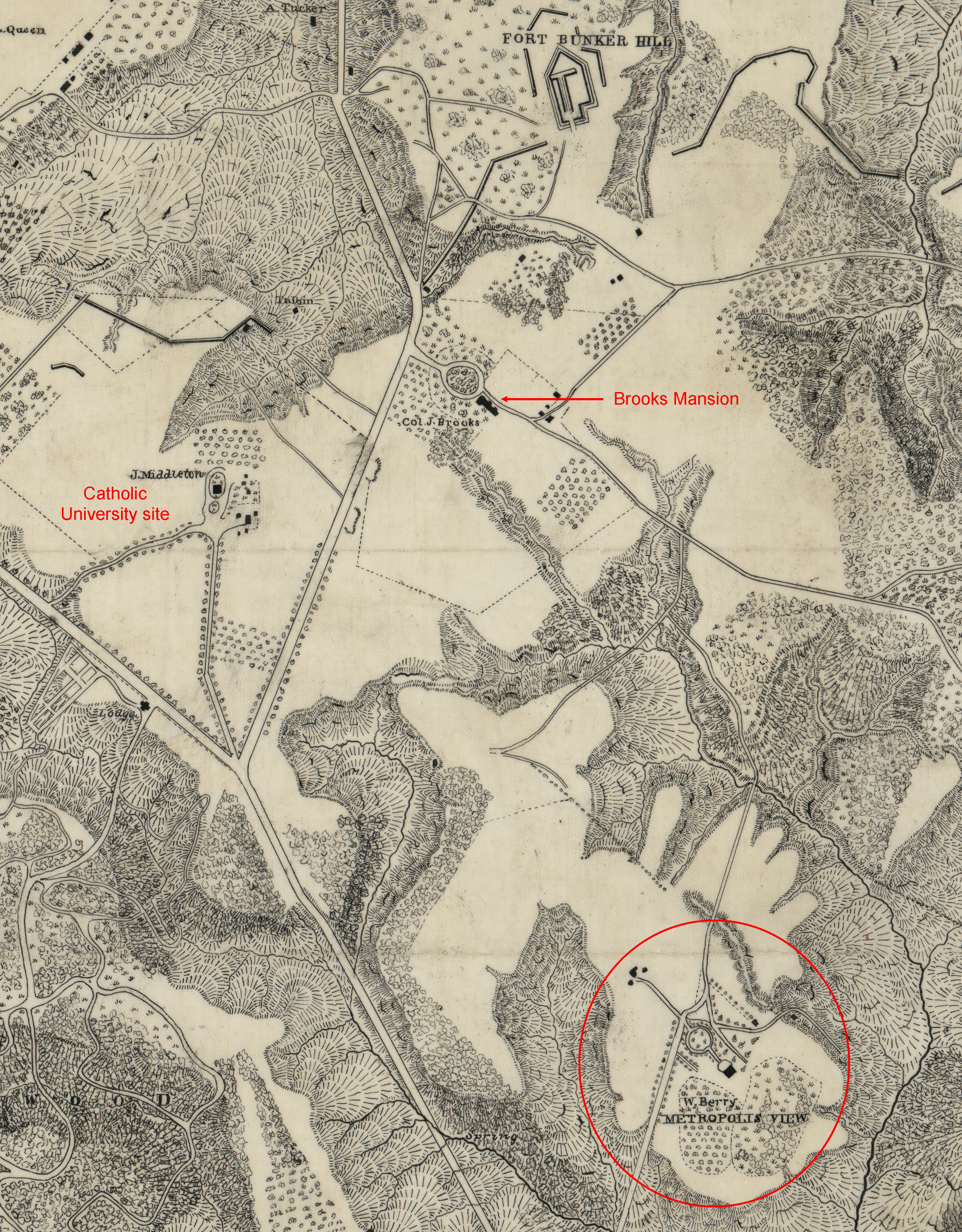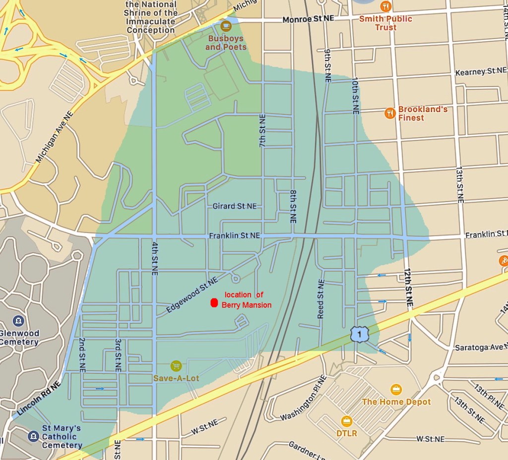 That chunk of land to the west of Colonel Brooks’ estate and south of the Middleton estate (where Catholic University is now) was once a 410-acre tract known as Metropolis View and owned by Washington Berry.