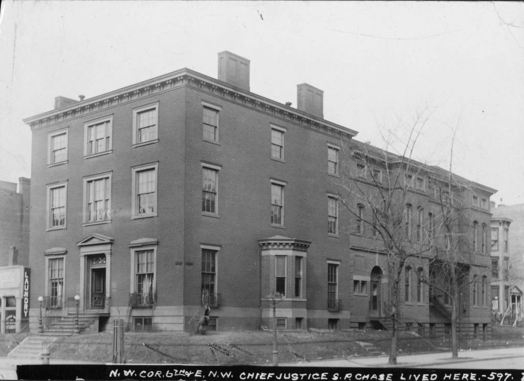 Husband, wife and father all lived in the house at 6th & E (right, click to enlarge. Willard R. Ross Postcard Collection, DC Public Library). The couple began having children, a family that would eventually grow to three girls and one boy, but it was not a stable relationship. Tensions arose regularly between Kate and her husband. Salmon Chase would often counsel his daughter to acquiesce to Sprague, even if he was in the wrong. It didn’t help. Relations between husband and wife continued to worsen, and Salmon Chase recognized it was time for him to move out.
