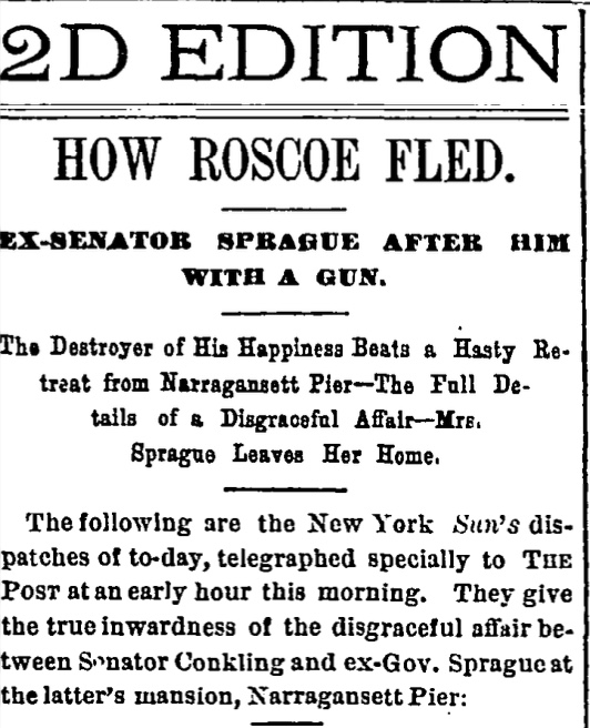 It all came to a head in 1879 when Kate was staying at the Sprague’s summer home in Narragansett Pier, Rhode Island. Her husband was supposed to be away on business, but returned unexpectedly to find Roscoe Conkling there with Kate. Exactly what happened next has always been a little murky due to the principals changing their stories numerous times, but it appears Sprague exploded in anger, loudly ordered Conkling off the property, then chased after him, perhaps with gun in hand. The newspapers had a field day piecing the story together from eyewitness accounts. Here are the headlines in the Washington Post a few days after the event:
