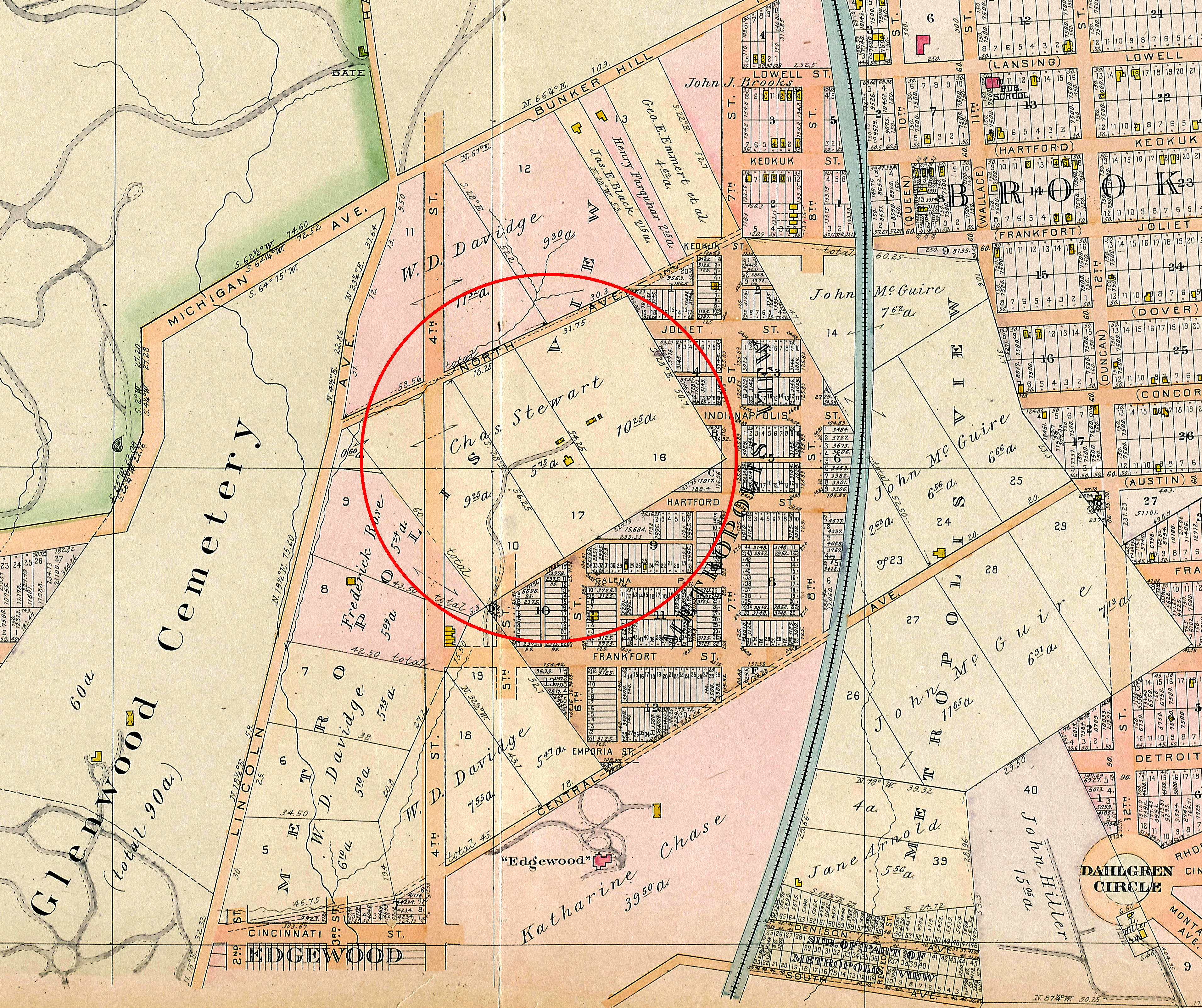 In late 1888, 4th Street was extended from Eckington up to Bunker Hill Road, cutting into both the Edgewood estate and the Stewart farm. But it also brought the electric streetcar, which acted as a spur to development. In 1890, Kate Chase and her creditors platted the portion of her estate that sat between 4th Street and Lincoln Avenue, calling the subdivision Edgewood. And in 1891 William Denison platted the lots to the east and south of the Stewart farm as the subdivision Metropolis View.