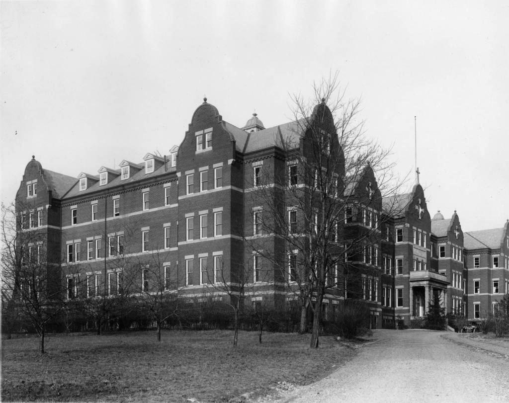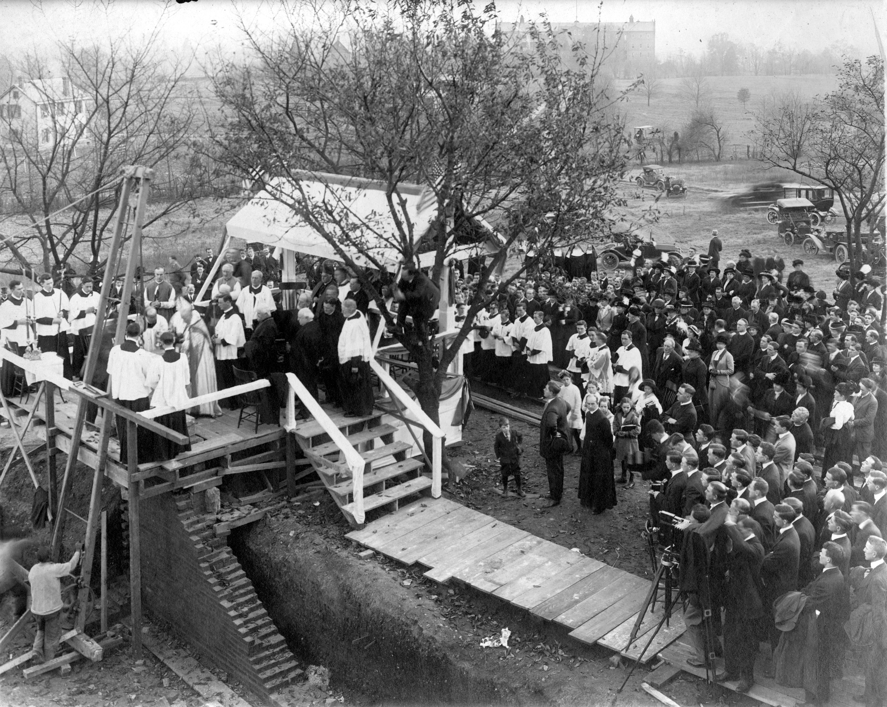 The picture of that event shows Cardinal James Gibbons, on the left of the platform by the derrick, blessing the cornerstone surrounded by Catholic dignitaries and the onlooking crowd, but it’s the background I find intriguing. The camera is facing south, and on the horizon St. Vincent’s Orphanage is clearly visible. Through the branches you can see the dirt track of a rudimentary 6th Street leading up to the orphanage. And on the far left is the Charles Stewart farmhouse, soon to be razed as the college was constructed. It is a rare expansive look at the landscape of Metropolis View.