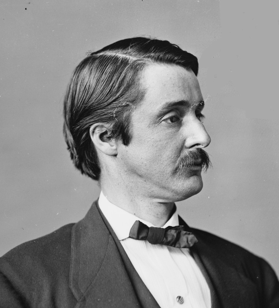 Even though her father was gone, Kate kept hosting her weekly salons, continuing to impress her guests with an adroit command of political strategy and tactics. Now the dinner parties were held at Edgewood, rather than the 6th St. house, and political luminaries continued to drop by. One of Kate’s favorites was New York Senator Roscoe Conkling, one of the most powerful Republicans in the Senate (left). Considered one of the handsomest men in politics, to Kate Chase Sprague he was everything her husband was not; well-read, a brilliant speaker, and physically fit, a man who neither drank nor smoked. He was also married. That Kate and Conkling began having an affair was common knowledge on Capitol Hill and soon in the gossip columns as well. That William Sprague had a long-time mistress, Mary Viall, was also common knowledge, but the newspapers were far more interested in Kate. Gossip reporters like Miss Grundy and Donn Piatt made her a true national celebrity, though not in the way she would have preferred.