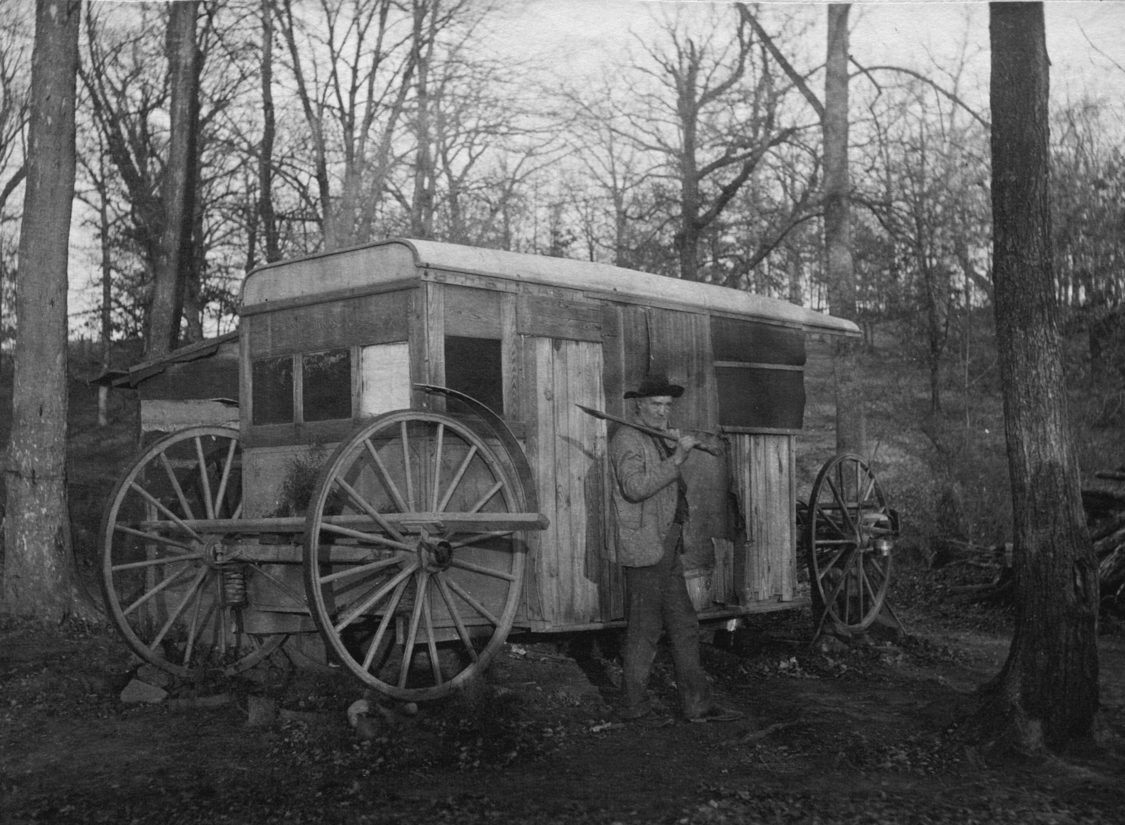 I think the photo of the man with an axe or shovel was Addison M. Copen. He was actually not one of the gypsies. Addison was a veteran of the Mexican American War who ran away from home around 1835 and basically lived a nomadic life thereafter. He worked on steamboats, tried his hand at farming but nothing really worked out for him. In 1888 he bought an old Herdic (wagon) and boarded up one side and built a lean-to on the other side. He slept inside and used the lean-to as a kitchen. He moved it to the northern end of Lincoln Avenue opposite Glenwood Cemetery near the gypsy encampment. He was interviewed for the local newspapers in 1888. The Herdic in that picture perfectly matched the description in the article.