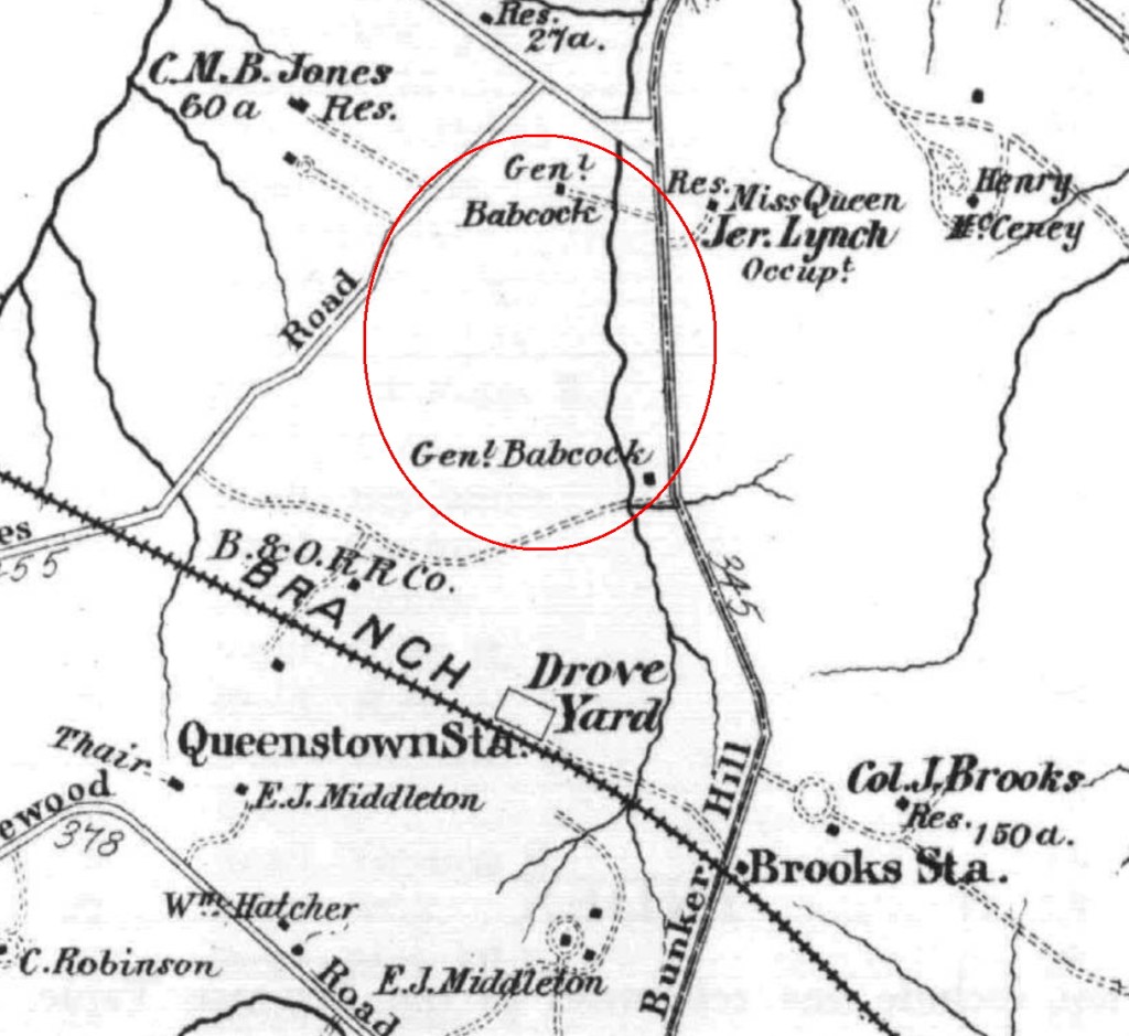 As for his farm here, like many wealthy Washingtonians, Babcock had a main house downtown, with a retreat on the city outskirts. He might have spent time on the farm in the summers, but it is most likely he used it as an investment, running the farm on shares with two co-owners. In the late 1870s the property was bought by Lewis Means, who ran the B&O Railroad drove yard on the former Queen farm right next door. The house he lived in, which was there during Babcock’s tenure and lasted well into the 20th century, came to be known as the “Old Means Place,” and was torn down when the Brookland School was constructed there in the 1970s.