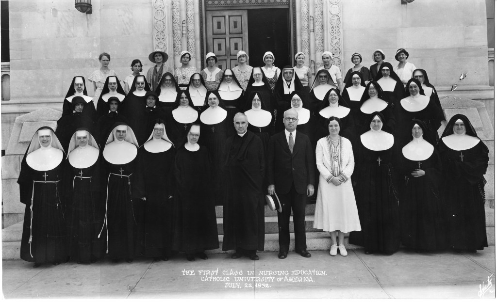 Around this time, nursing education in the United States was beginning a slow shift from hospital to university schools. Deferrari, now Dean of the Graduate School of Arts and Sciences, wanted to do for nursing students what he and Fr. Shields had done for education students. He wrote to Rector James Ryan about offering a program for nursing through Sisters College. He received what he termed “unenthusiastic permission” from the rector to try out several courses in the summer session. He then talked to Rev. Thomas Verner Moore about incorporating nursing education as part of his department of Psychology and Psychiatry. Moore agreed, and suggested Sr. Olivia Gowan, O.S.B. to head the program. So, in the summer of 1932, Catholic University’s first class in Nursing Education began. Here they are, standing on the steps of Mullen Library, with Roy Deferrari front and center: