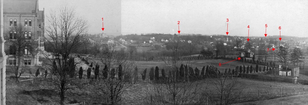 The above photograph is the result of merging two views Ross took from the balcony of Holy Cross College (now O’Boyle Hall) on the northern edge of the Catholic University campus. To the immediate left is the front of Marist College (now Marist Hall) with Catholic University’s campus sweeping downhill to the right. The open fields beyond the second tree line were once part of the Nicholas Queen farm, but by 1910 the property was owned by the Baltimore & Ohio Railroad, and today it is the Turkey Thicket recreation area. Above that is Bunker Hill Road, now named Michigan Avenue, with the houses of Brookland sprinkled over the rolling hills.