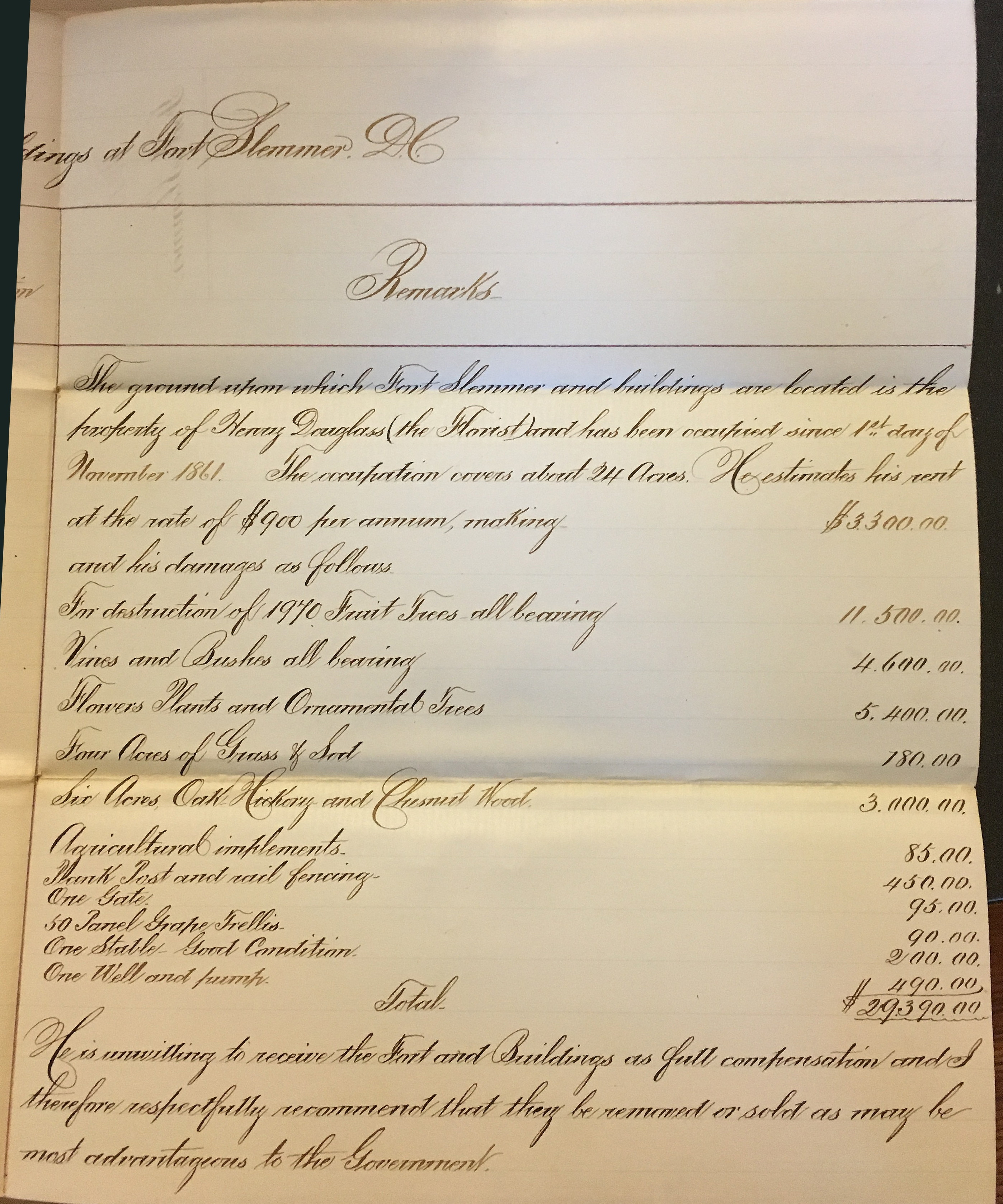 “The ground upon which Fort Slemmer and buildings are located is the property of Henry Douglass (the Florist) and has been occupied since 1st day of November 1861. The occupation covers about 24 acres. He estimates his rent at the rate of $900 per annum, making $3,300 and his damages as follows.