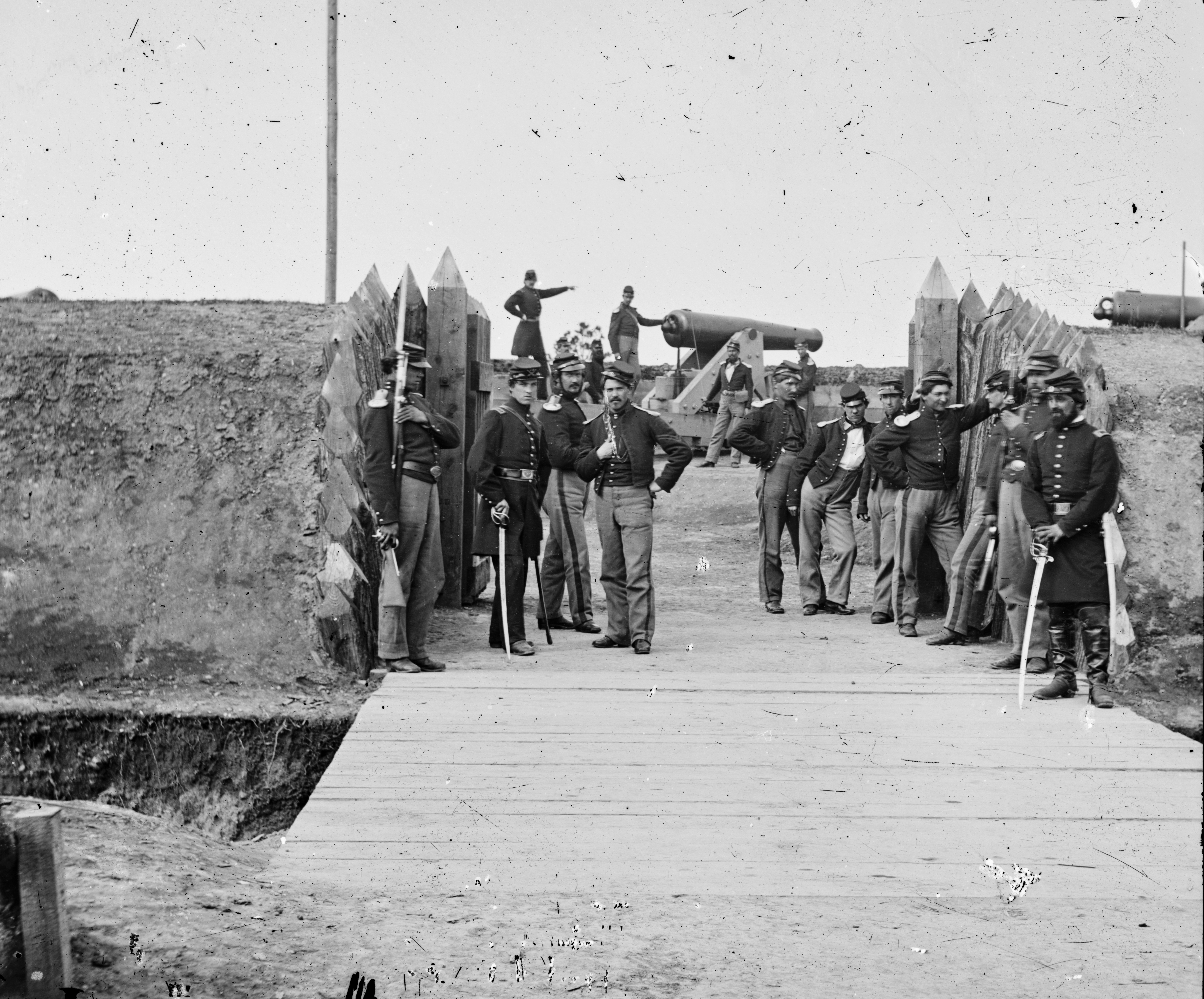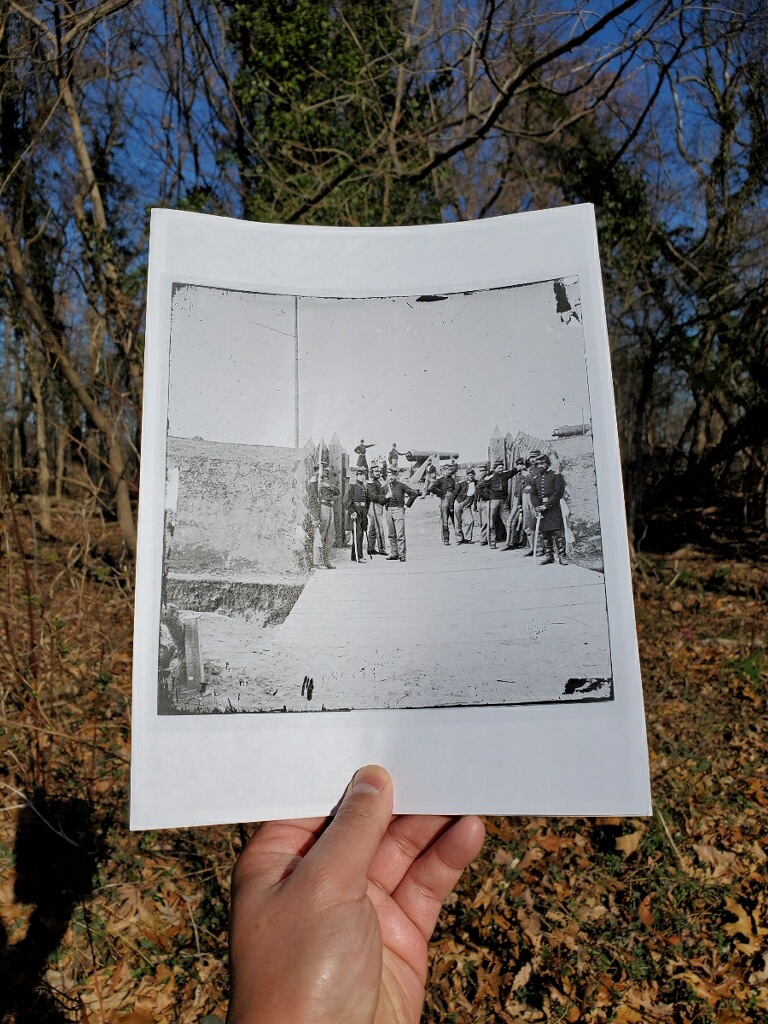And here is the completed fort, photographed in 1862 or 1863. This is an exceptional image that shows in detail the elements of the fort. The howitzer hasn’t been mounted yet, but the three cannon are apparent. The earthen walls are well defined but would need constant maintenance. Wooden planks suppport the inner wall. The ditch along the outside of the walls is there, with the men marching over it on a wooden bridge. The abatis would be intimidating for any enemy to try to breach.