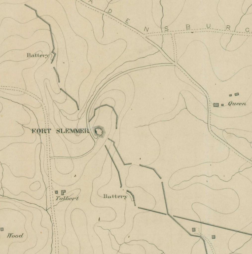 Fort Slemmer was built in November 1861, to fill in the gap between forts Bunker Hill and Totten, on land that is now a part of the Catholic University of America. It was one of the smallest of the enclosed forts, with only three 32-pounder seacoast guns and one 8-inch howitzer.