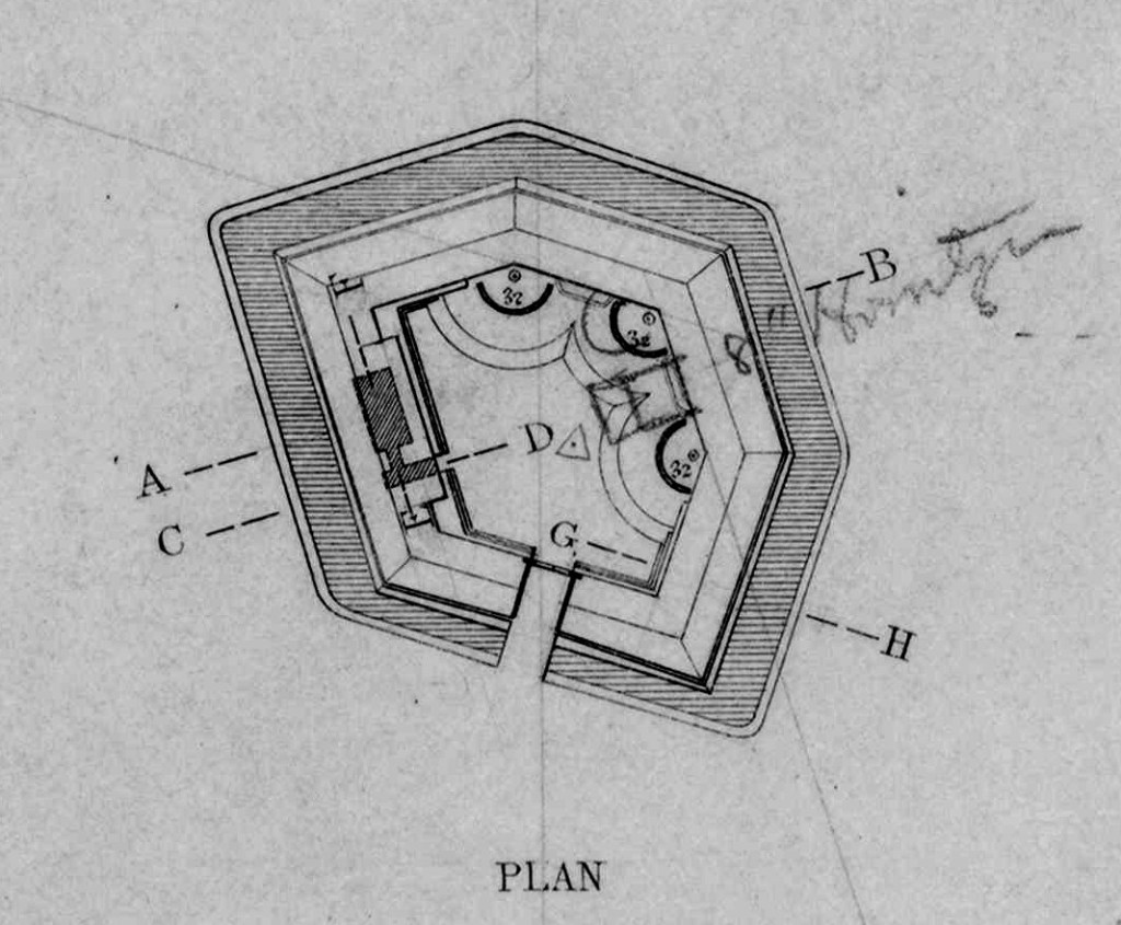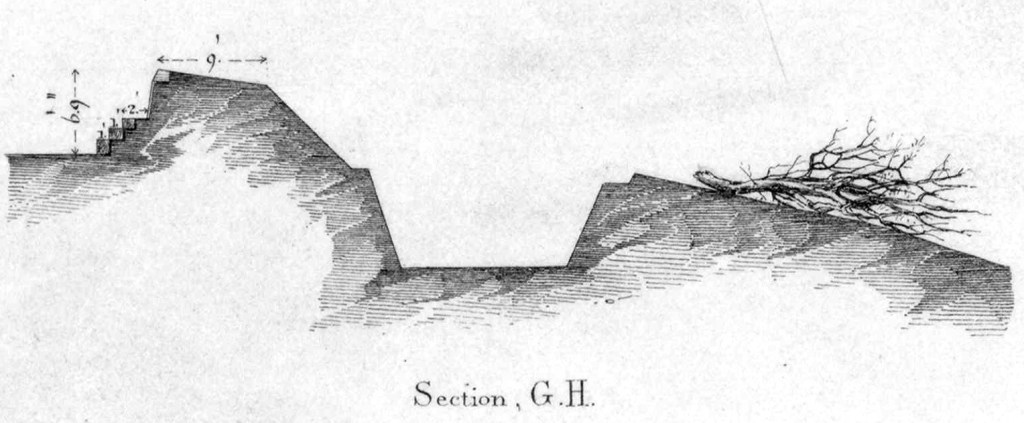 Below is a cross section of the eastern portion, showing the interior of the fort on the far left, the rampart, with a 9 foot parapet, the ditch around the fort, and the sharpened tree branches known as abatis. The slope the abatis sits on is called the glacis, and was angled so cannon fire would hit it and bounce up and over the fort. The guns were mounted en barbette, i.e. they sat on raised platforms and fired over the parapet, not through an opening in the rampart wall, so they were more exposed.