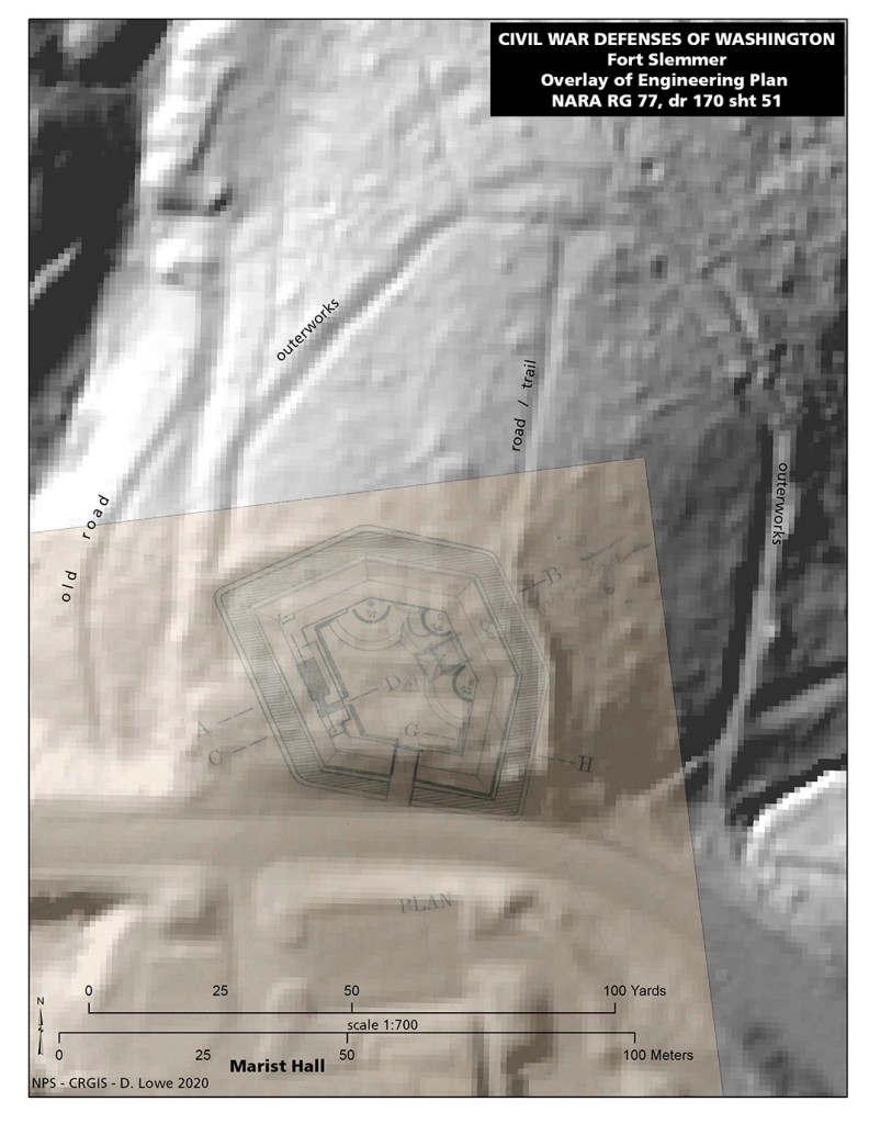 Phan and Lowe have been revitalizing interest in the Civil War Defenses of Washington in the last few years, conducting tours, writing articles, and creating detailed maps of the various fort sites under Park Service control. David Lowe uses LiDAR mapping to get an accurate picture of the terrain. Here is the LiDAR map of the Fort Slemmer site he overlaid with the outline of the fort: