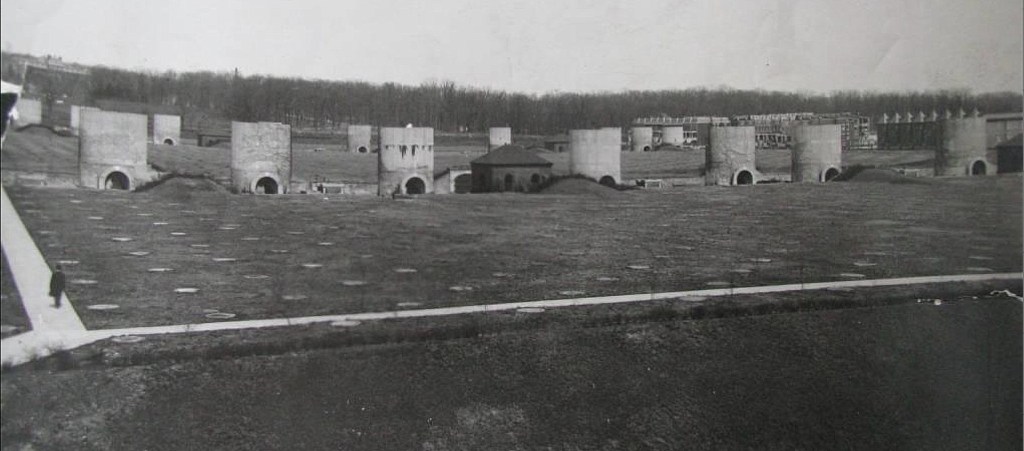 The diagram below shows what a pair of filter beds would look like when complete. Each covers an acre of land and contain numerous vaulted bays. Water would be piped from the reservoir to the top of the filters, then percolate through the sand and gravel. A thin layer of biofilm formed on the surface of the sand, and the microorganisms that developed within it did the actual filtering of organic matter. The cleaned water would then exit through a drain at the bottom of the vault. The filters were covered with 2 feet of topsoil, and each bay had a manhole where clean sand could be added.