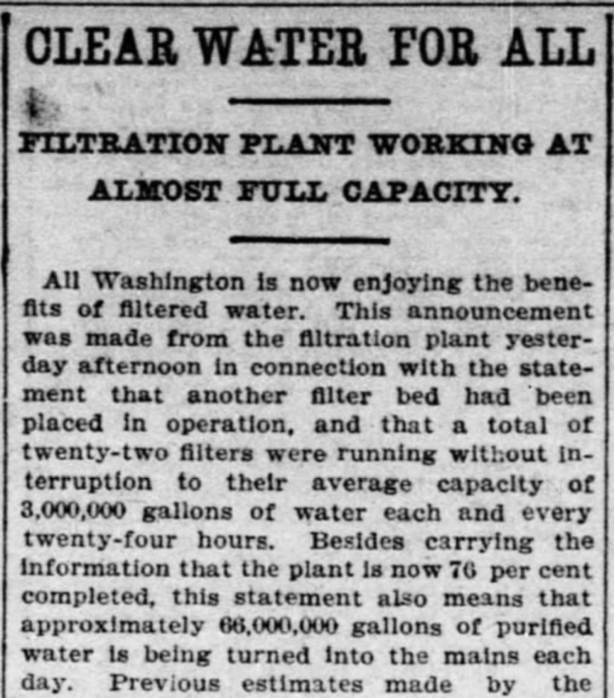 After nearly three years of planning and construction, the filtration plant was put into operation in the autumn of 1905. The effect on the water was immediately noticeable with a substantial increase in clarity and a drop in colon bacilli. Typhoid fever and malaria epidemics were soon dramatically reduced. As a work of civil engineering, the filtration plant was a great success and played a hugely important role in the health of Washingtonians for the next 80 years.
