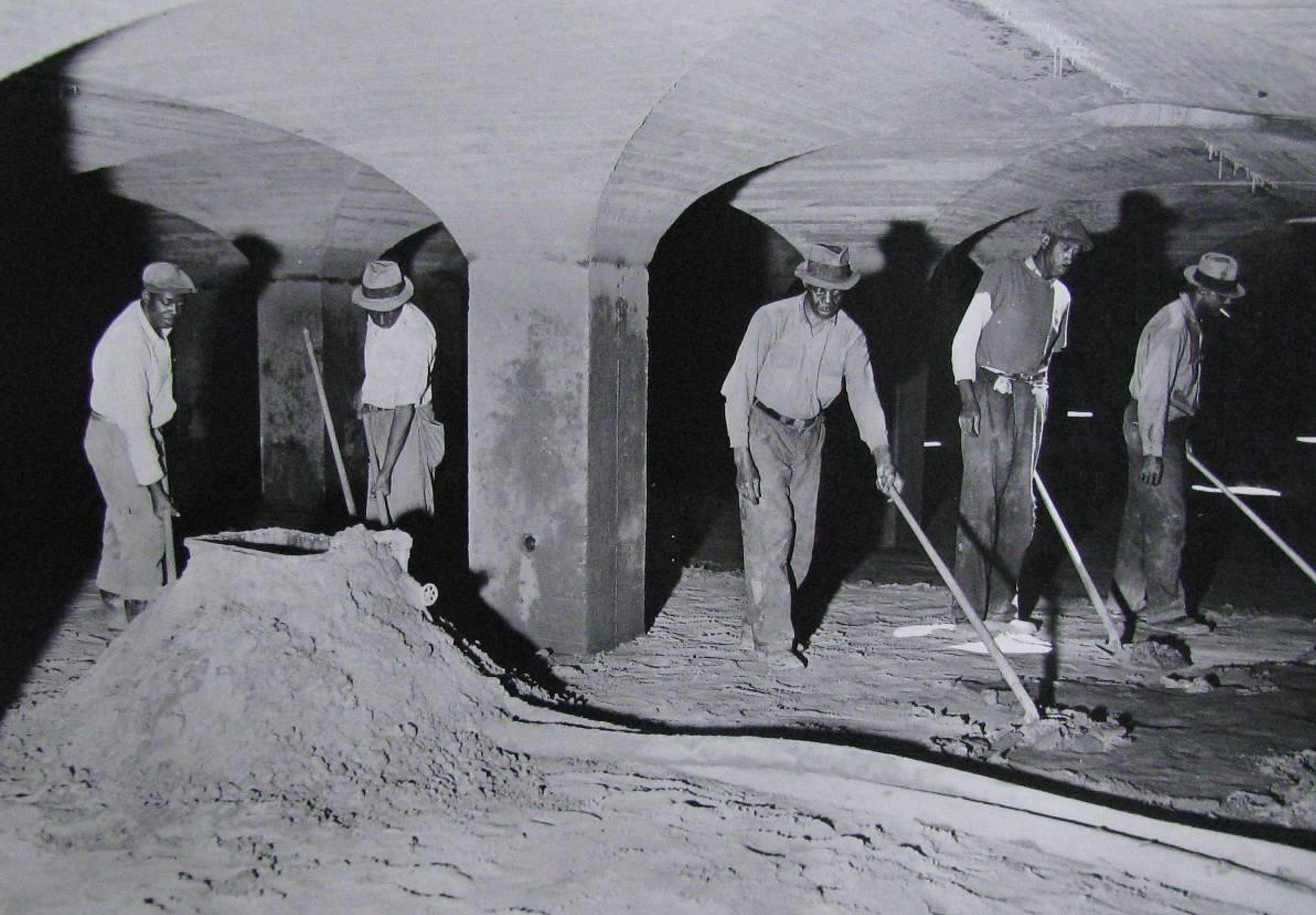 Here is a photo of workers shoveling the dirty sand into an ejector for washing. Working in the filter beds was not the most pleasant experience, but leaving the manholes open allowed for light and ventilation.