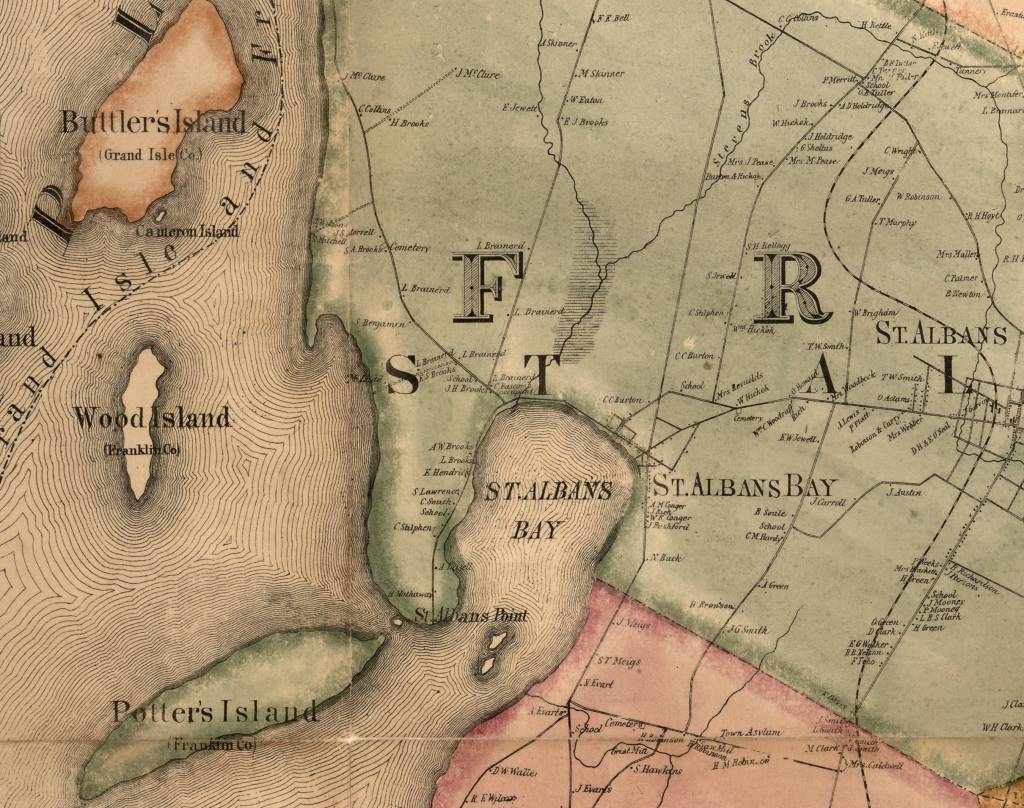 After the war, Hananiah moved to St. Albans where his uncle Eleazar had lived since 1785. His father Adonijah soon joined them and began to raise livestock on a five acre plot of land at St. Albans Point on the bay. A number of Adonijah’s brothers and sisters also settled there. Almost a century later, many Brooks descendants were still living in St. Albans, as can be seen in this 1857 map. The St. Albans Point cemetery is still known as Brooks cemetery to many locals. Click to enlarge.
