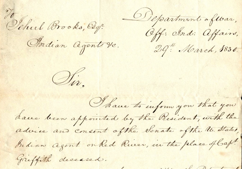 George Gray died suddenly in November 1828, and the Red River Indian Agent position became available. Brooks wanted the job, and quickly enlisted friends and acquaintances far and wide to recommend him to a variety of congressmen, the Secretary of War, and the President himself. Canny regarding this political appointment, Brooks made sure a few letters mentioned his long-time and ardent support for President Jackson and his policies, and that he was formerly in Jackson’s army. He travelled to Washington to personally lobby for the job.