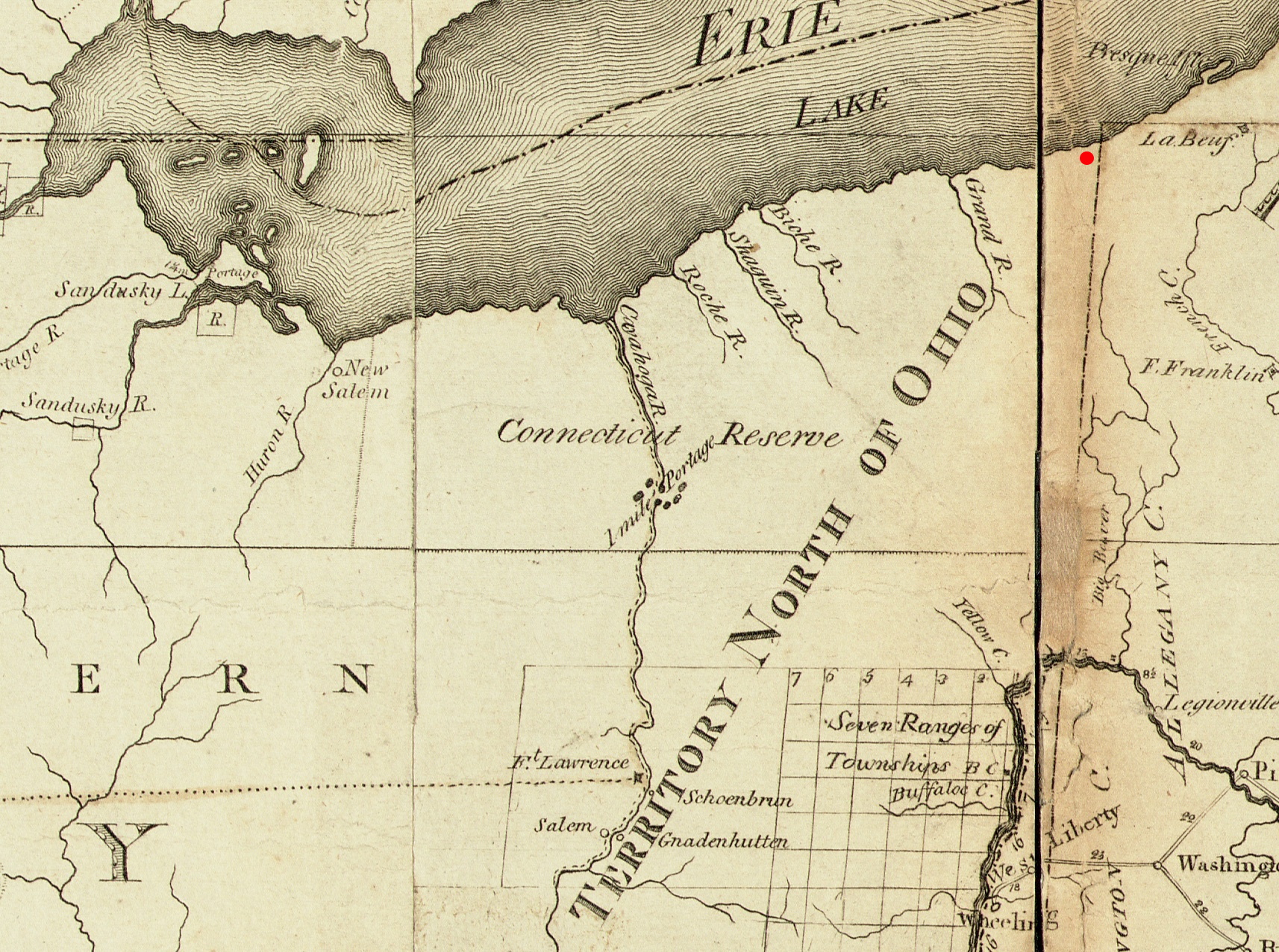Hananiah and family left St. Albans around 1800 to venture further west. What is commonly called the Northwest Indian War of 1786-1795 had ended with the treaty of Greenville, which opened up the territory of Ohio for American settlement. That is where Hananiah headed, winding up in what would become the fledgling town of Conneaut, just over the Pennsylvania border on Lake Erie (marked with a red dot on the map below). Jehiel grew up there, surrounded by early white settlers and the remnants of the Native American tribes that had been driven away.