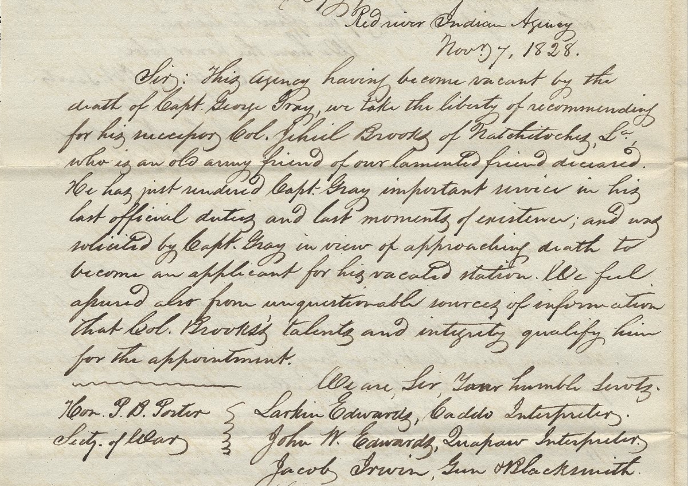 George Gray died suddenly in November 1828, and the Red River Indian Agent position became available. Brooks wanted the job, and quickly enlisted friends and acquaintances far and wide to recommend him to a variety of congressmen, the Secretary of War, and the President himself. Canny regarding this political appointment, Brooks made sure a few letters mentioned his long-time and ardent support for President Jackson and his policies, and that he was formerly in Jackson’s army. He travelled to Washington to personally lobby for the job.