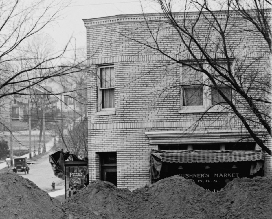 The only information on the original National Photo Company image is the name “S.W. Barrow.” After a little research, I found a Samuel Wheeler Barrow living on 20th St., right around the corner. Barrow was a real estate salesman, but why his name is on the photos is unknown. Zooming in, there are some interesting details visible. Grocer Joseph Kushner opened his market at 3500 18th Street in 1926.
