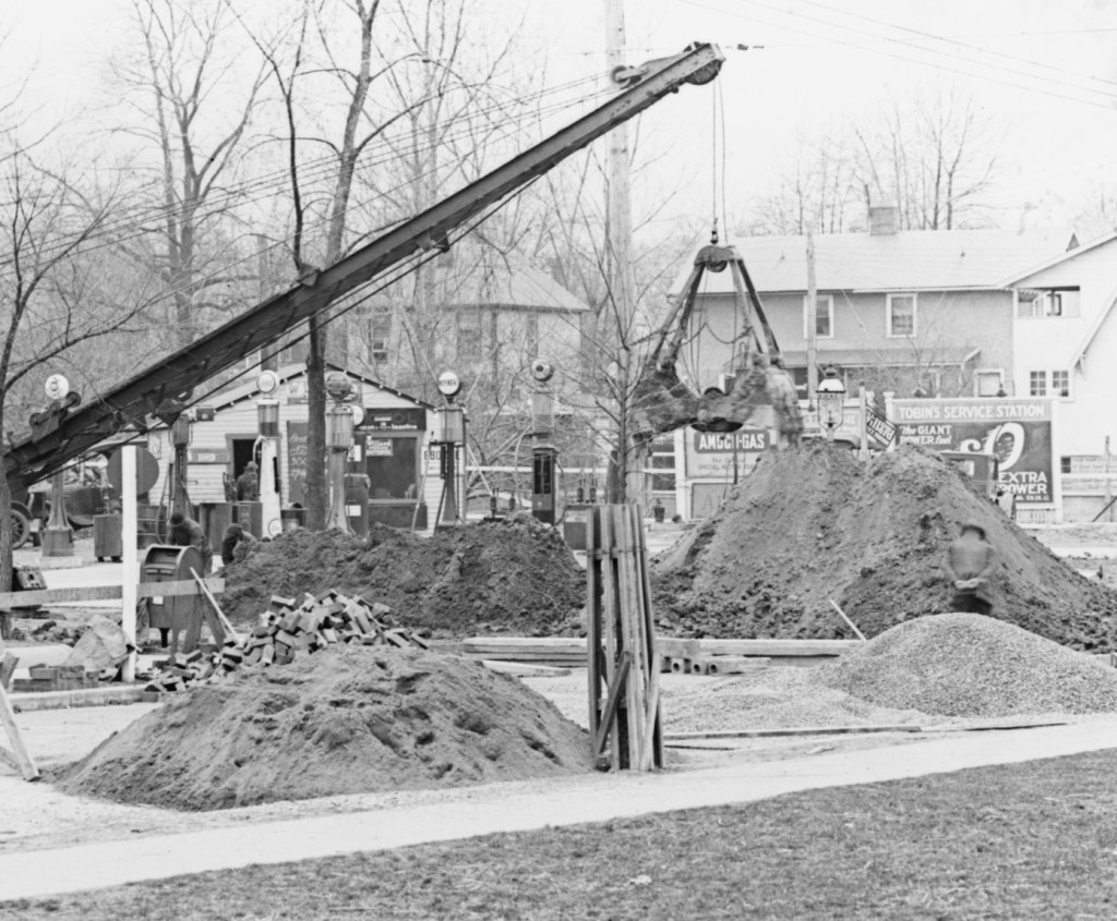 John Tobin’s Service Station, on the southwest corner, opened in 1926. I count seven gravity-fed pumps, which makes it quite a large operation. A year later, the first electric pumps would be installed. Although owners and brands changed over the years, a service station has been in business at that location for 96 years. Today it is an Exxon.