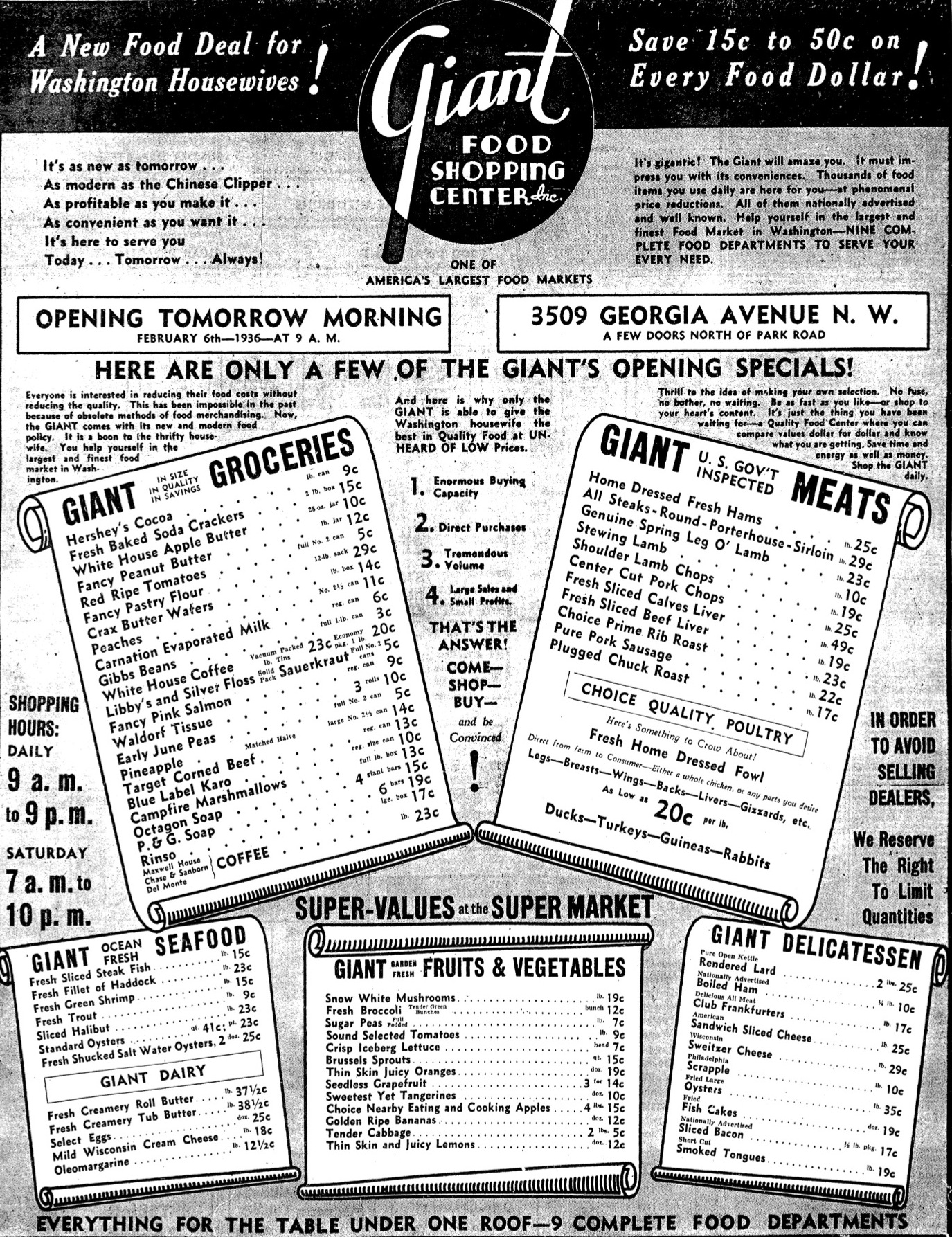 Grocery innovations would continue and expand, and soon would come the supermarket, which changed everything once again. The Food Marketing Institute and Smithsonian Institution have determined that the very first supermarket was opened by Michael J. Cullen in 1930 in Queens, New York. He called it King Kullen with the motto: “Pile It High, Sell It Low!” Safeway and others hesitated at first, but with the Great Depression kicking in, the search for low food prices became more urgent for consumers. Giant Food built the first supermarket in the Washington area, in February of 1936. It was an immediate success.