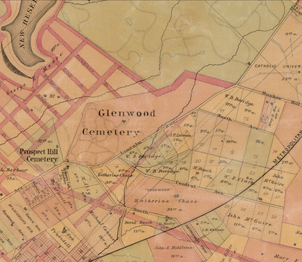 That same year, Glenwood Cemetery ran into some significant financial difficulties and decided to sell the northern section of their land to Maurice Talty, representing the Sisters of Notre Dame de Namur, who were looking for land to start Trinity College. It was the ideal location for the new Catholic women’s school, just a few hundred yards west of Catholic University, which had opened in 1889 and did not admit women.