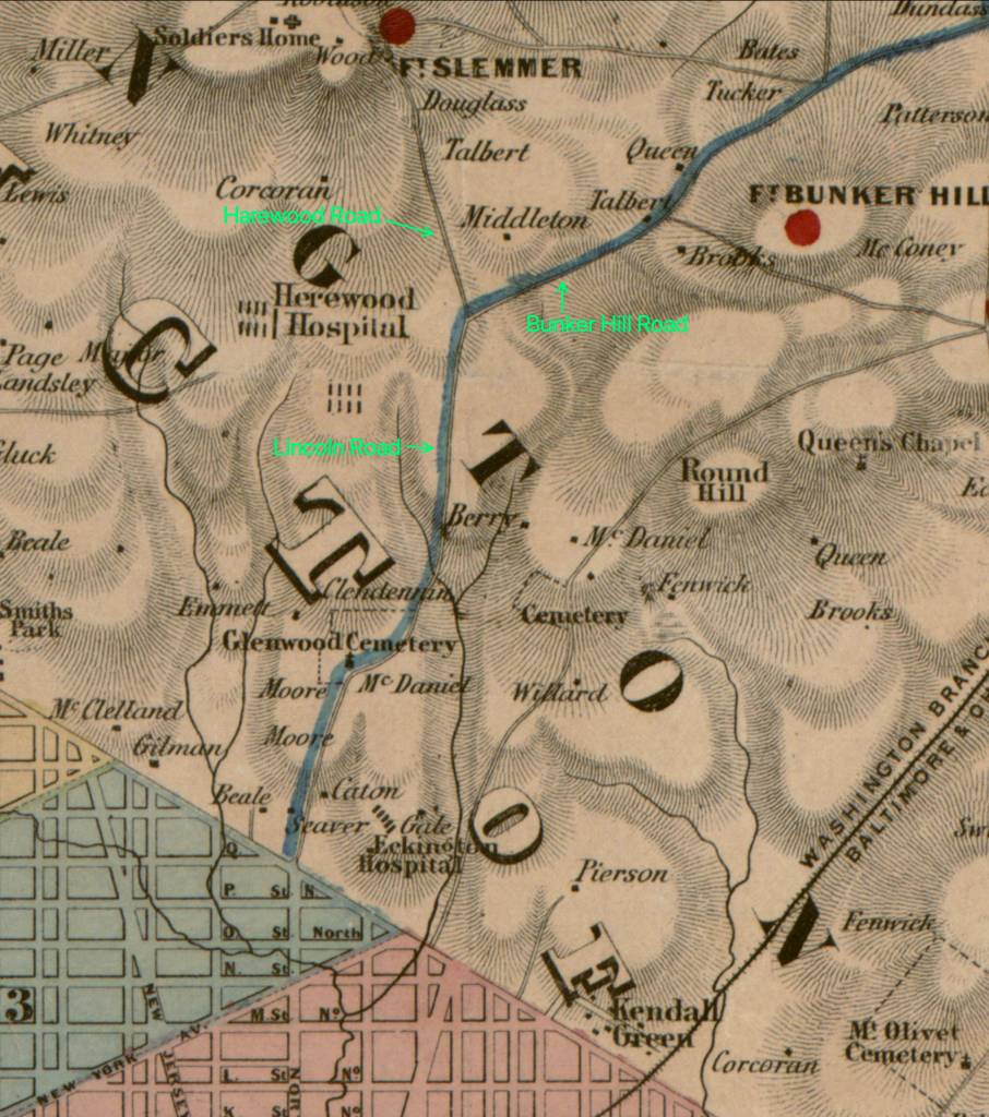 Both the Soldiers’ Home and Glenwood Cemetery were popular spots for carriage rides and picnics in the late 19th century, and Lincoln Avenue was well utilized. It remained a primary route until 1888, when 4th Street was extended north from Eckington to Bunker Hill Road. A year later, an electric streetcar ran up 4th to Catholic University. See the map below.