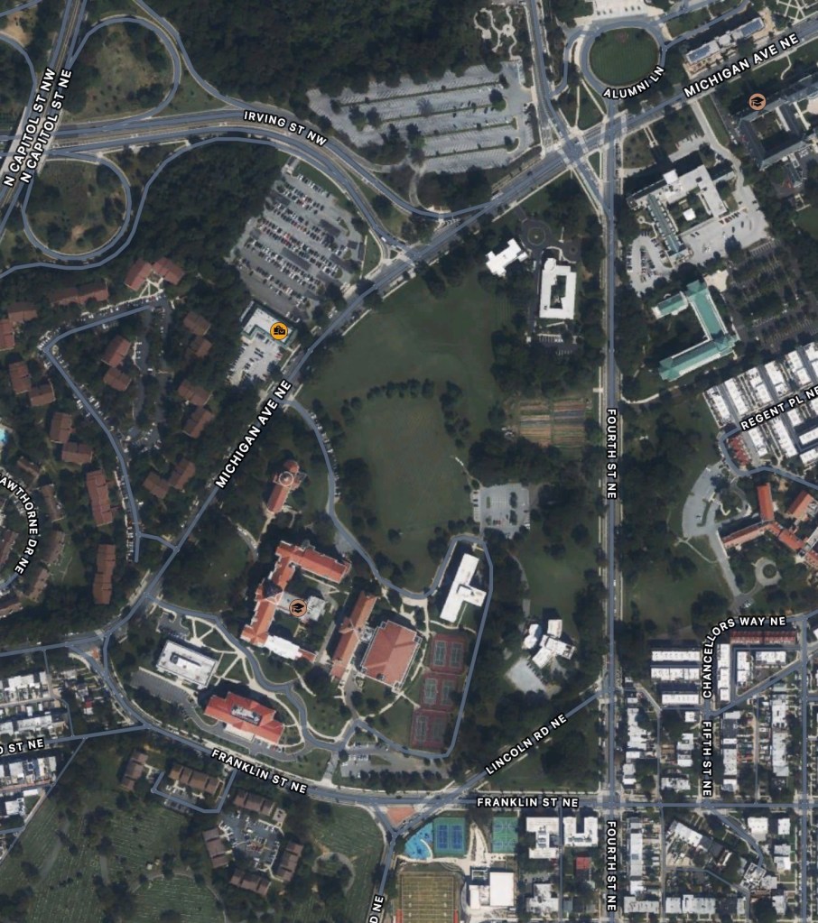 The above snapshot was taken by James Carroll, a Catholic University student, back in 1917. He was standing on the roof of Gibbons Hall, looking west down Michigan Avenue. Michigan, with a center line of utility poles, bears left around the trees and leads to Trinity College (now Trinity Washington University), the dome of their Main Hall visible against the sky. In front of that is a house of studies that belongs to the Missionary Oblates of Mary Immaculate, built just the year before. On the left edge of the photo the building with the scaffolding around it is the Sulpician Seminary, then under construction, and today called Theological College. And at the bottom center 4th Street can be seen where it meets Michigan Avenue.