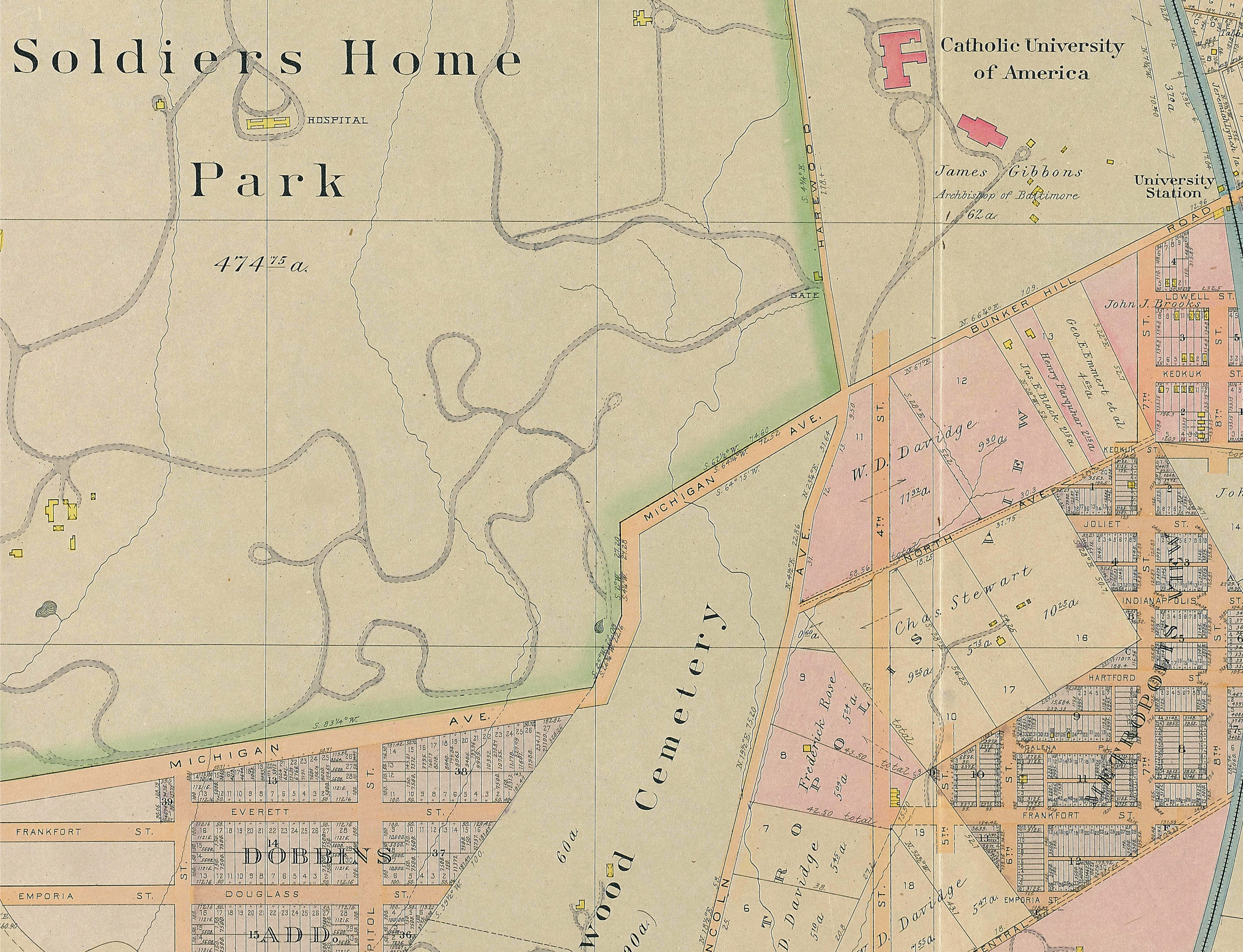 Both the Soldiers’ Home and Glenwood Cemetery were popular spots for carriage rides and picnics in the late 19th century, and Lincoln Avenue was well utilized. It remained a primary route until 1888, when 4th Street was extended north from Eckington to Bunker Hill Road. A year later, an electric streetcar ran up 4th to Catholic University. See the map below.