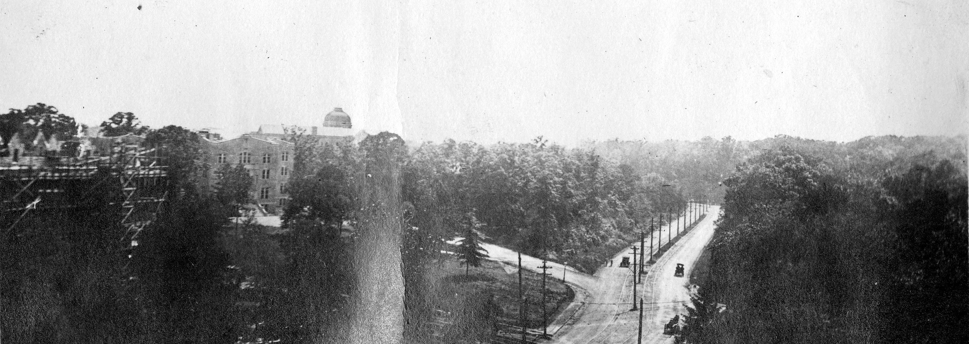 The above snapshot was taken by James Carroll, a Catholic University student, back in 1917. He was standing on the roof of Gibbons Hall, looking west down Michigan Avenue. Michigan, with a center line of utility poles, bears left around the trees and leads to Trinity College (now Trinity Washington University), the dome of their Main Hall visible against the sky. In front of that is a house of studies that belongs to the Missionary Oblates of Mary Immaculate, built just the year before. On the left edge of the photo the building with the scaffolding around it is the Sulpician Seminary, then under construction, and today called Theological College. And at the bottom center 4th Street can be seen where it meets Michigan Avenue.