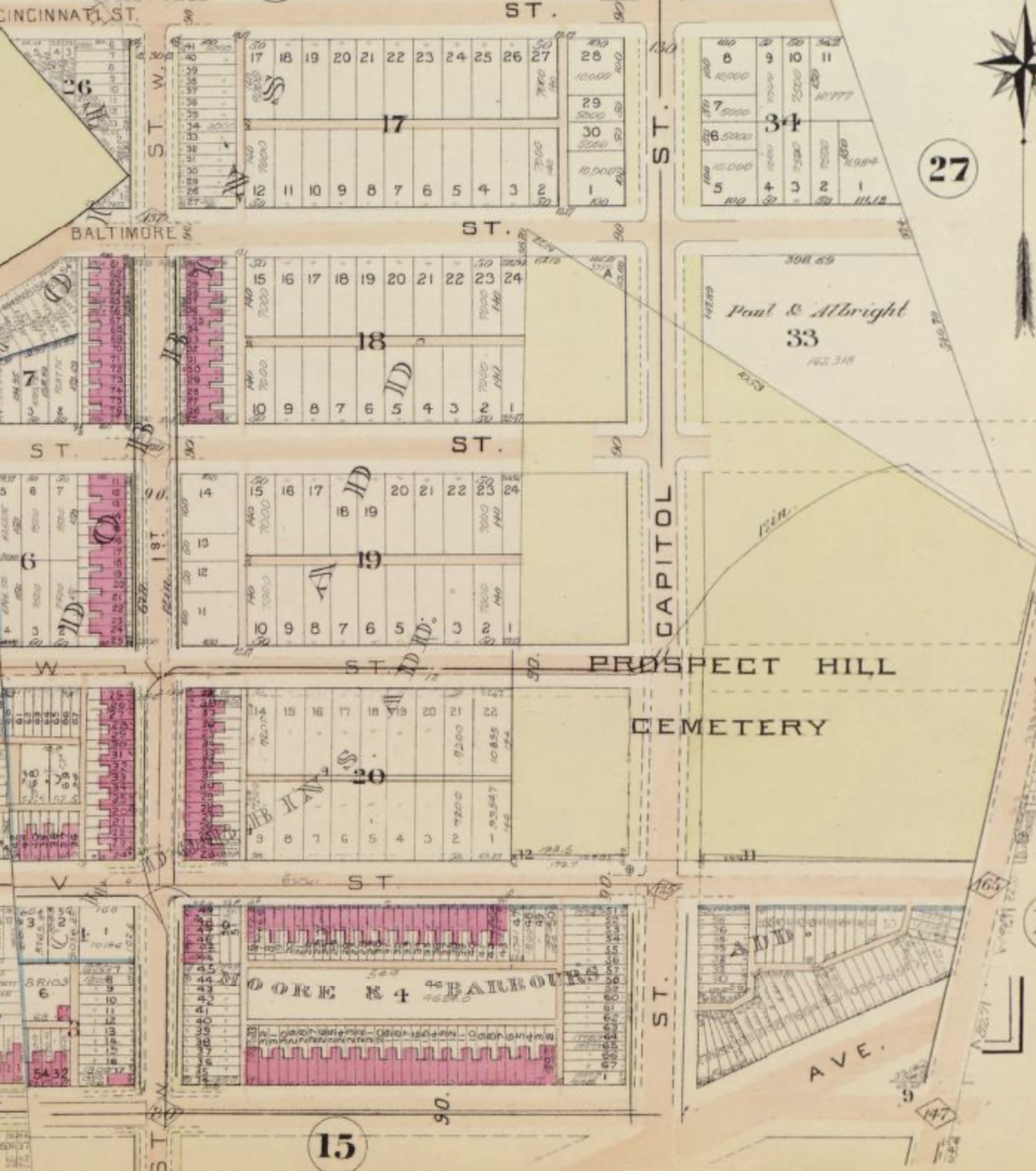 Prospect Hill Cemetery, also on Lincoln Avenue, was not as lucky. Adjacent to Glenwood on the south, Prospect Hill was a German-American cemetery, founded in 1858. The city very much wanted to extend North Capitol Street all the way to the Soldiers’ Home and Michigan Avenue, but the grounds of Prospect Hill were in the way. The fight to condemn the land and run North Capitol Street through would go on for twelve years, until the city and the cemetery finally came to terms in 1897 and the street was allowed to be completed, substantially reducing the size of the cemetery.